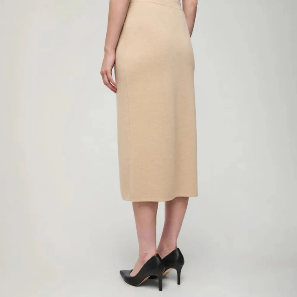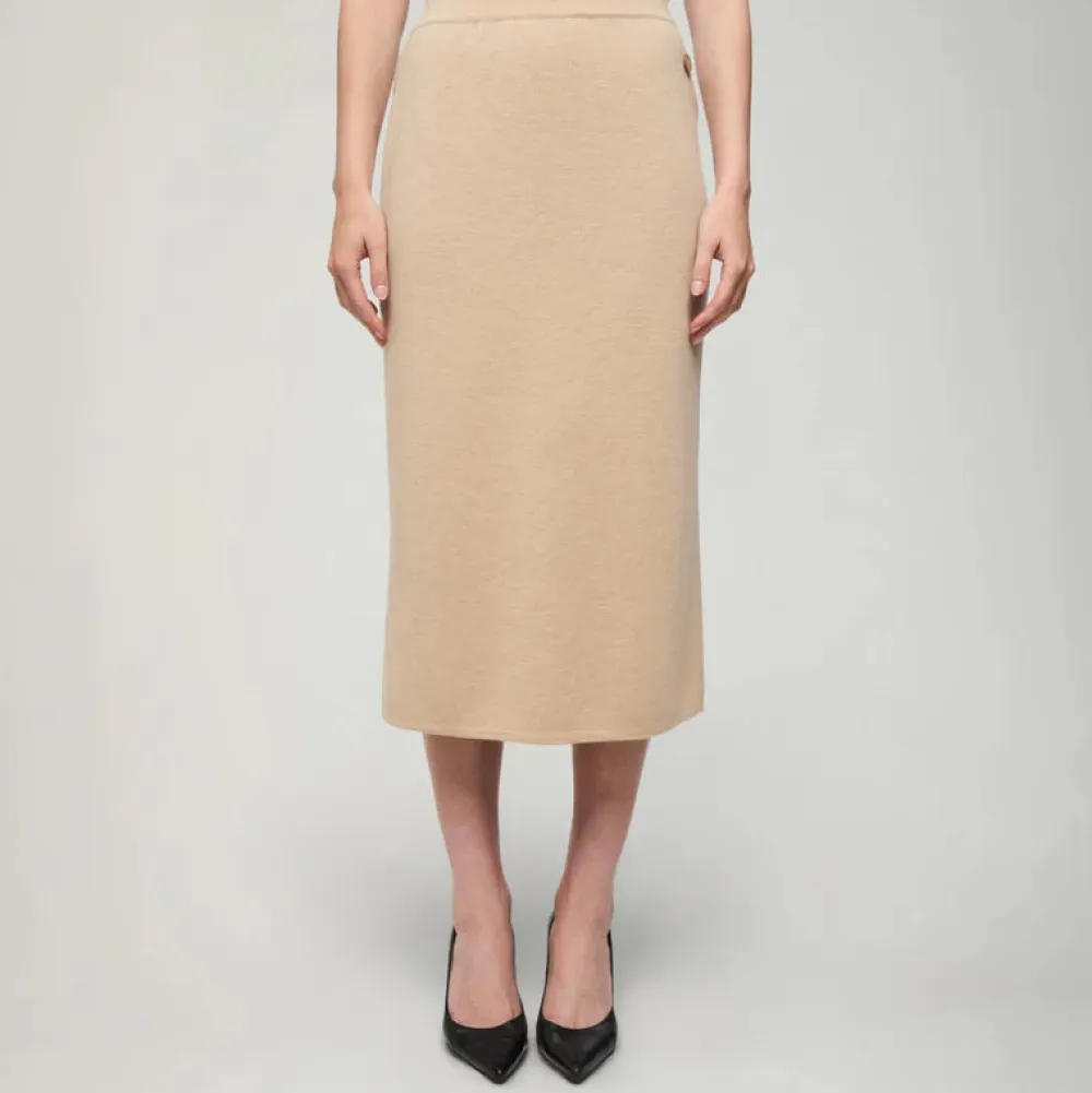 Suoralinjainen Hymy-neulehame on kestävä ja helppohoitoinen klassikko. Monikäyttöinen hame istuu kauniisti ja on sopivasti väljä. Hameen mukava ja hengittävä materiaali takaa sen, että villahame sopii käytettäväksi kaikkina vuodenaikoina. Kokonaisuuden viimeistelee helmassa oleva halkio ja Aarikan puunappi.