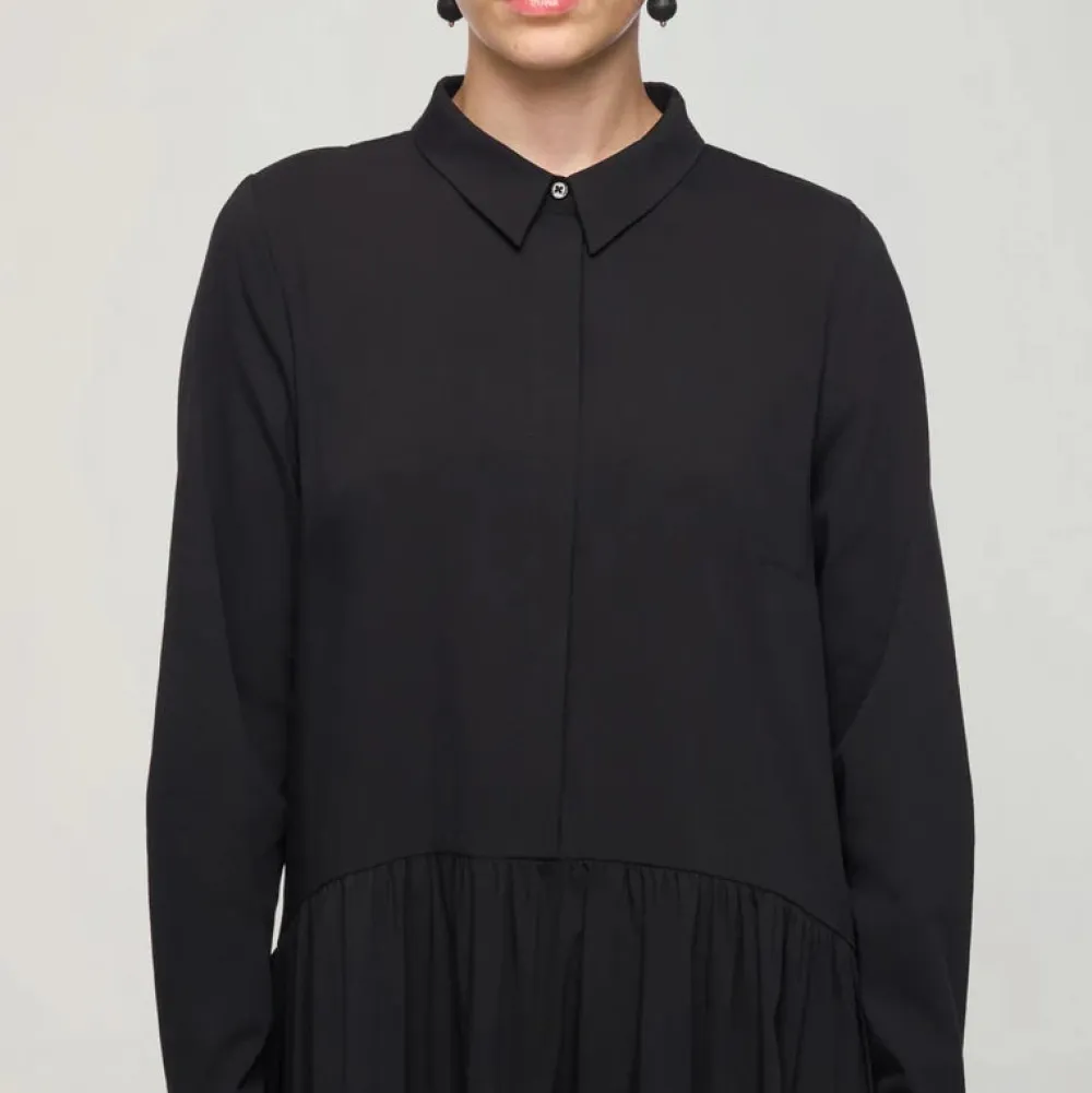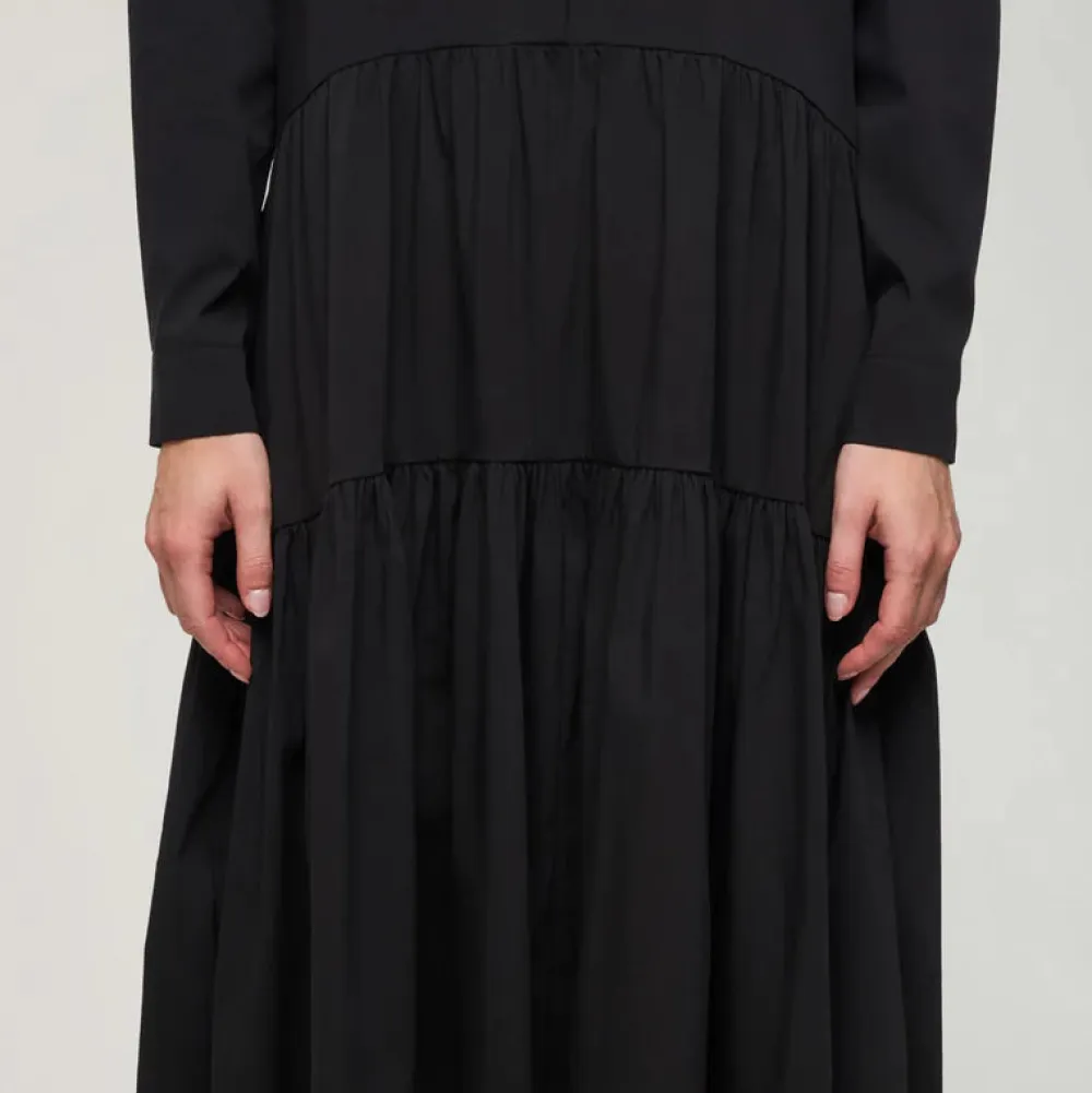 Pitkässä Triine-mekossa yhdistyvät kauluspaitamainen, istuva yläosa ja hulmuava, leveä helma. Mekossa on pitkät hihat ja kahdesta frillasta koostuva runsas helma. Materiaali on kevyen ylellistä ja joustavaa puuvilla-polyamidi-sekoitetta, ja siinä on tyylikäs ja hento kiilto.