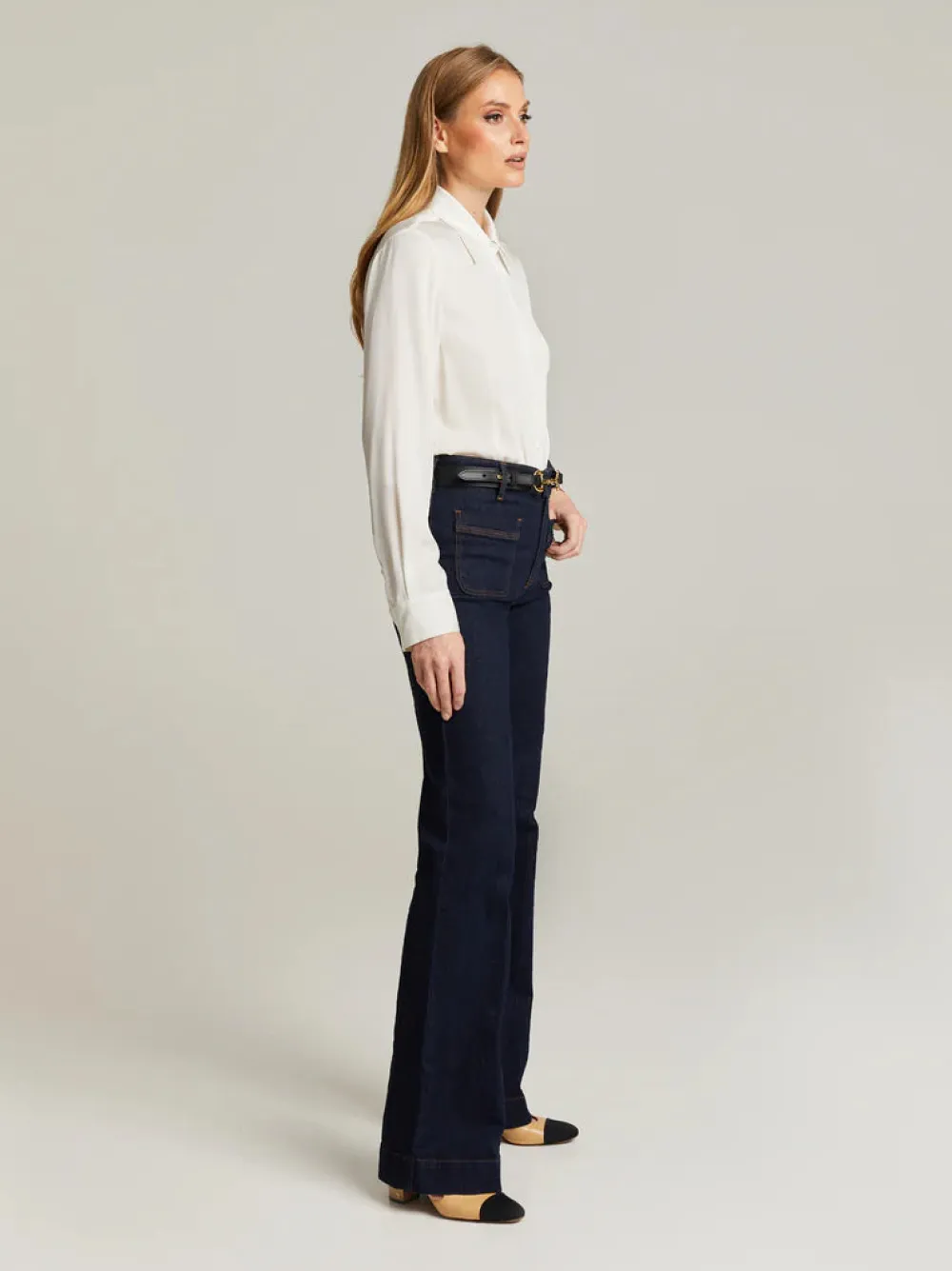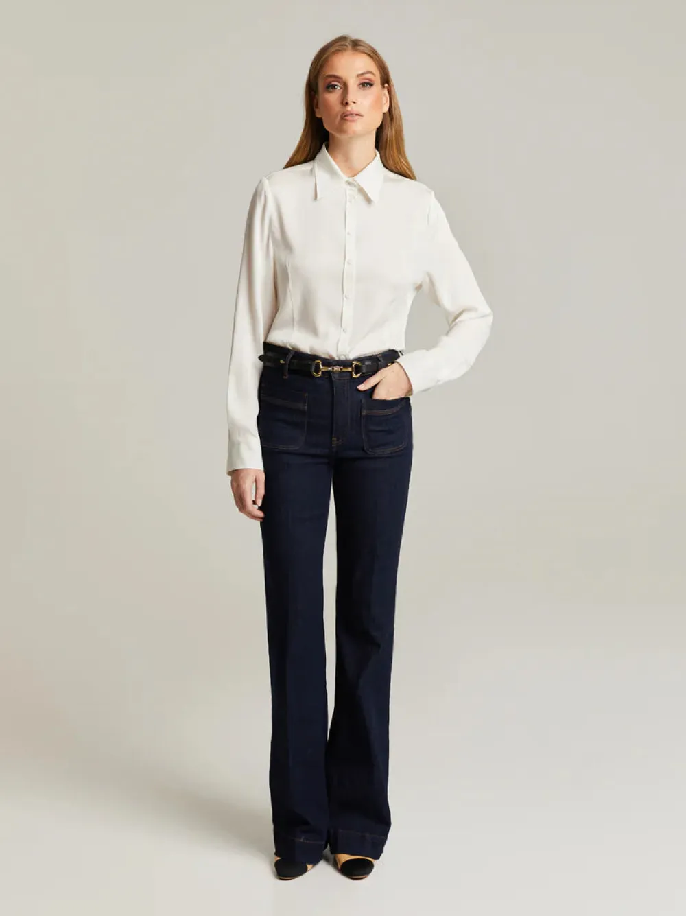 Täyspitkät farkut leventyvillä lahkeilla, paikkataskut edessä, tikatut prässit takana ja normaali vyötärönkorkeus.