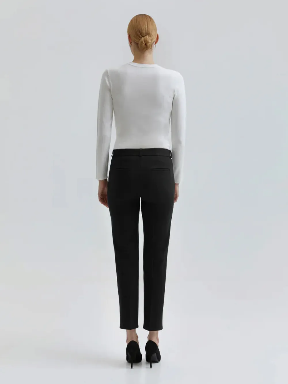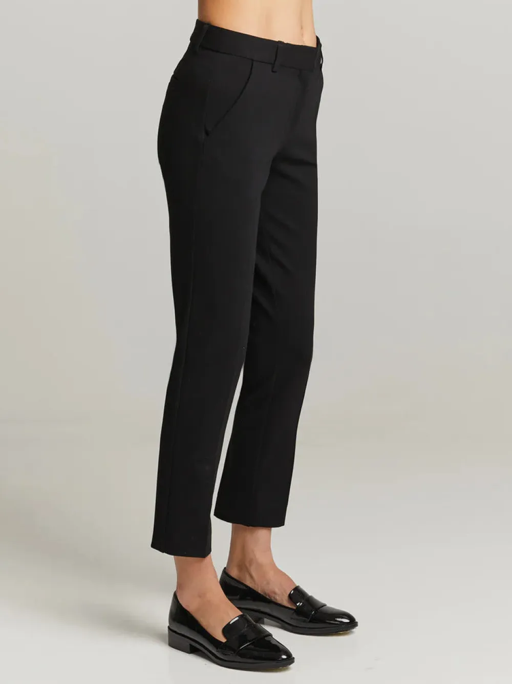 Klassiset nilkkapituiset, kapealinjaiset mustat housut paksusta ja joustavasta, miellyttävän tuntuisesta jersey-kankaasta. Keskikorkea vyötärö, vyölenkit ja sivutaskut. Vetoketju sekä piilotettu hakas- ja nappikiinnitys edessä.