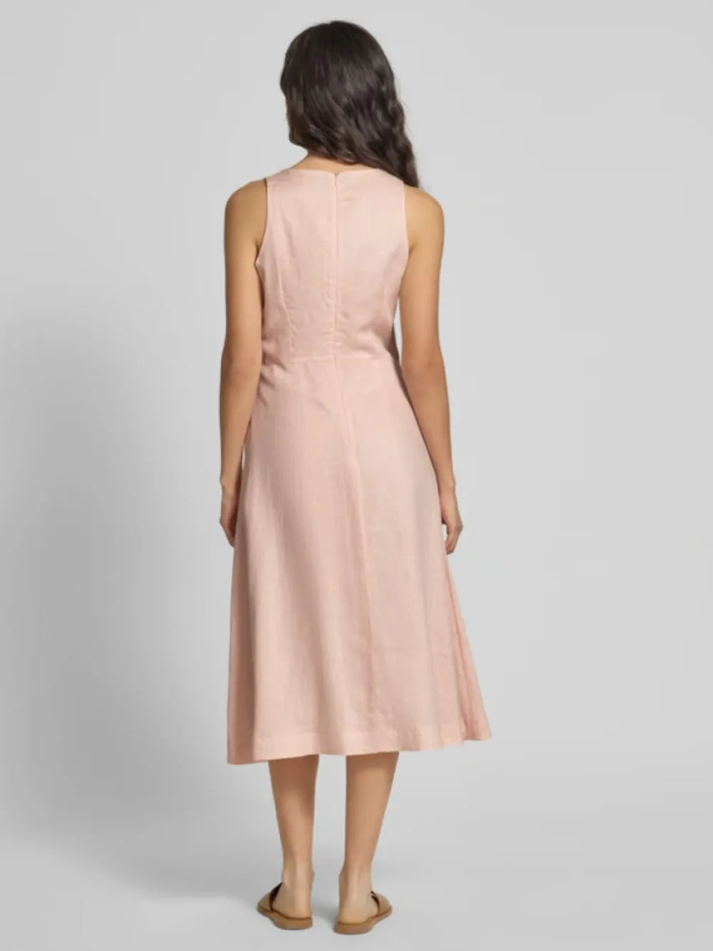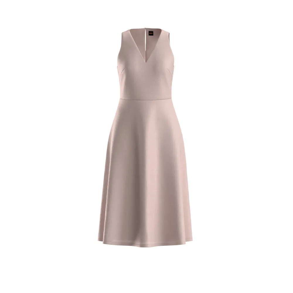 BOSS Orange midimekko halaa hellästi siluettia hieman räätälöidyllä leikkauksellaan. V-pääntie ja leveät olkaimet antavat mekolle tyylikkään ilmeen, kun taas laadukas materiaali lisää mukavuutta.