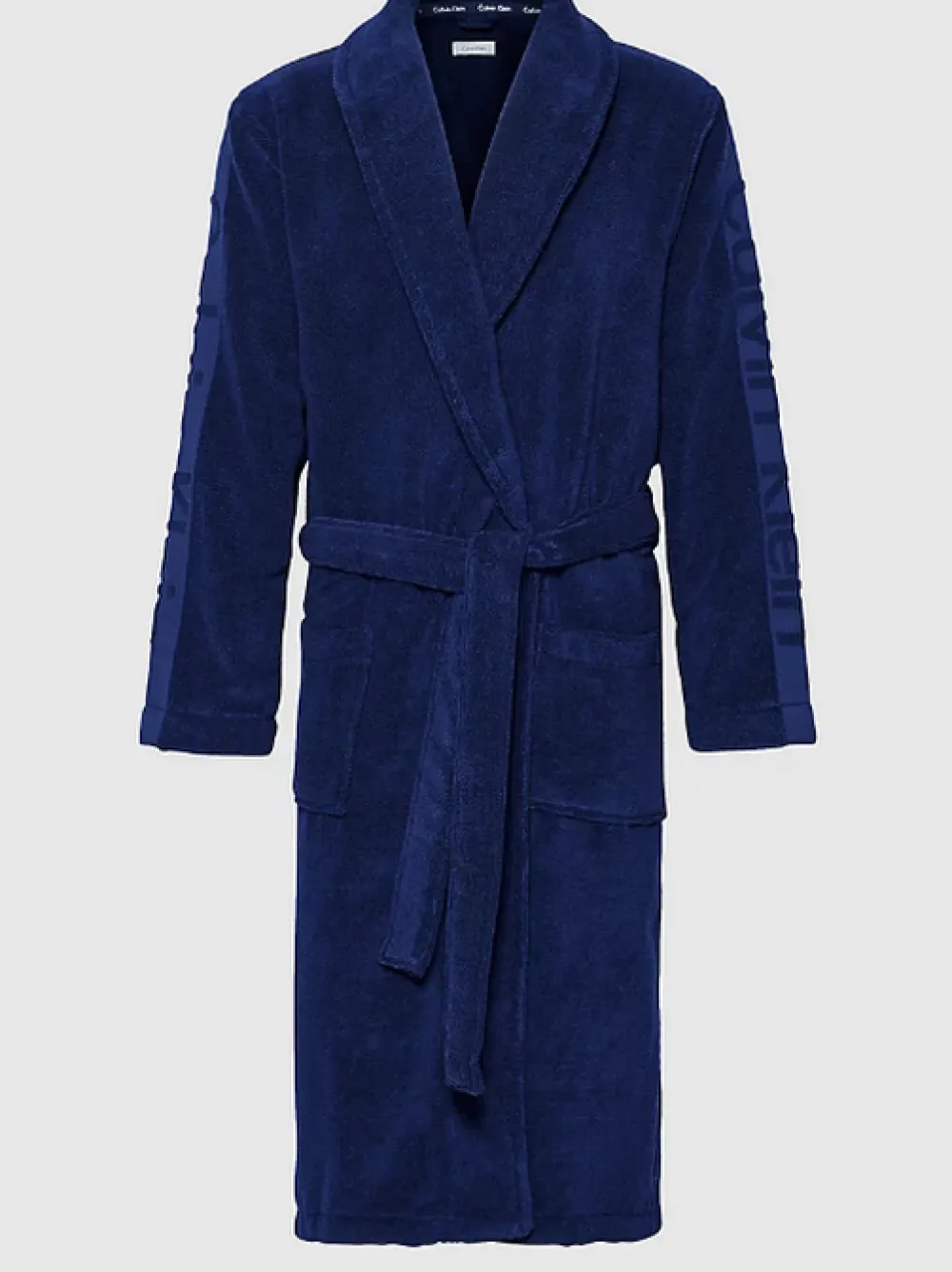 Calvin Klein miesten froteinen saalikauluksinen kylpytakki pitkillä hihoilla, taskuilla ja vyöllä.