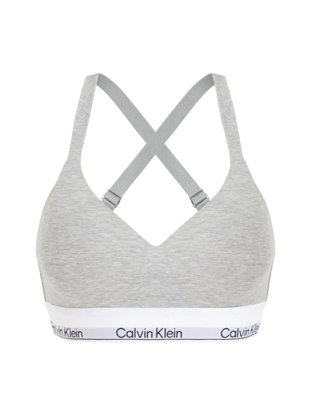 Calvin Kleinin bralette-liivi, jossa leveät, selästä ristiin menevät olkaimet ja joustava rinnanympärys koristeltuna Calvin Klein -logotekstein. Miellyttävä päällä, mutta myös tukeva. Liivi on aavistuksen topattu.