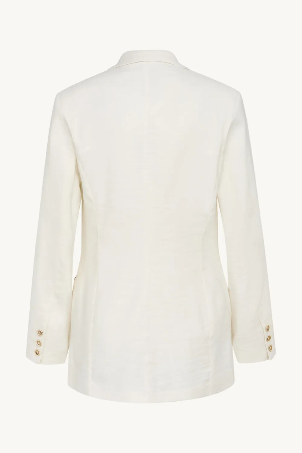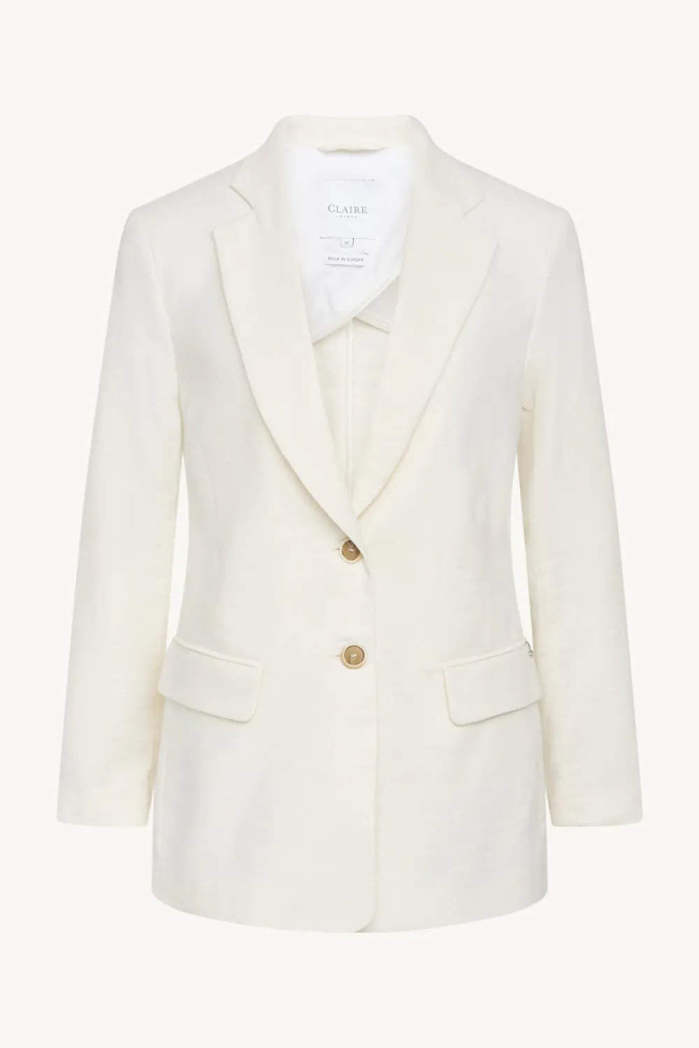 Puolivuorattu bleiseri, jossa etutaskut, topatut olkapäät ja nappikiinnitys.