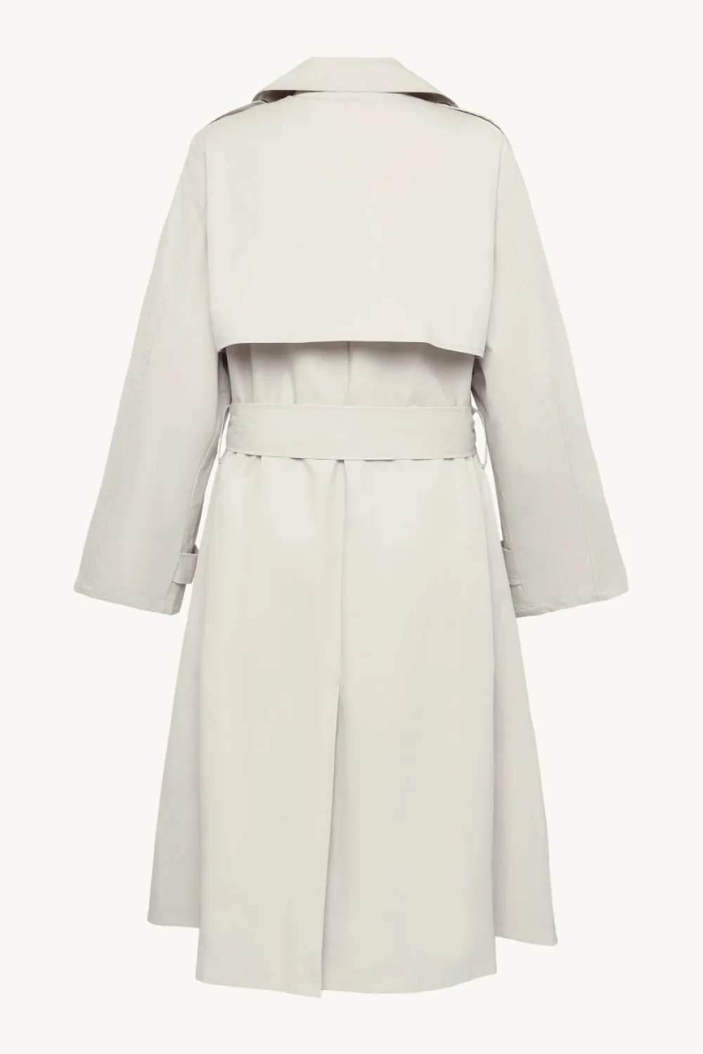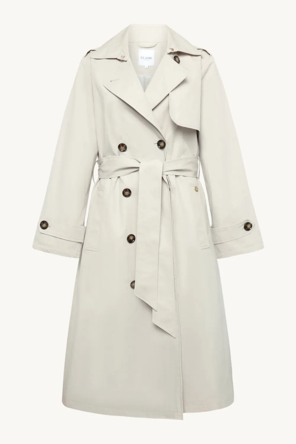 Vuorattu trenssi, jossa kaulus ja kaksirivinen nappikiinnitys. Siinä on vyö ja etutaskut.