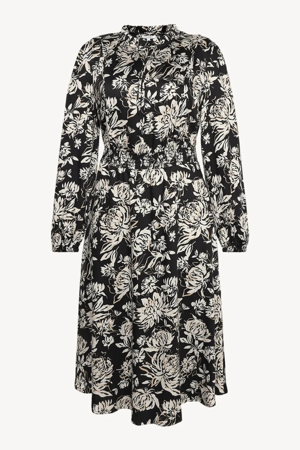 Clairen pitkä mekko kudotusta viskoosista, jossa on röyhelökaulus ja solmittavat nauhat pääntiessä. Mekossa on puhvihihat, joissa joustavat hihansuut ja smokkirypytys vyötäröllä.