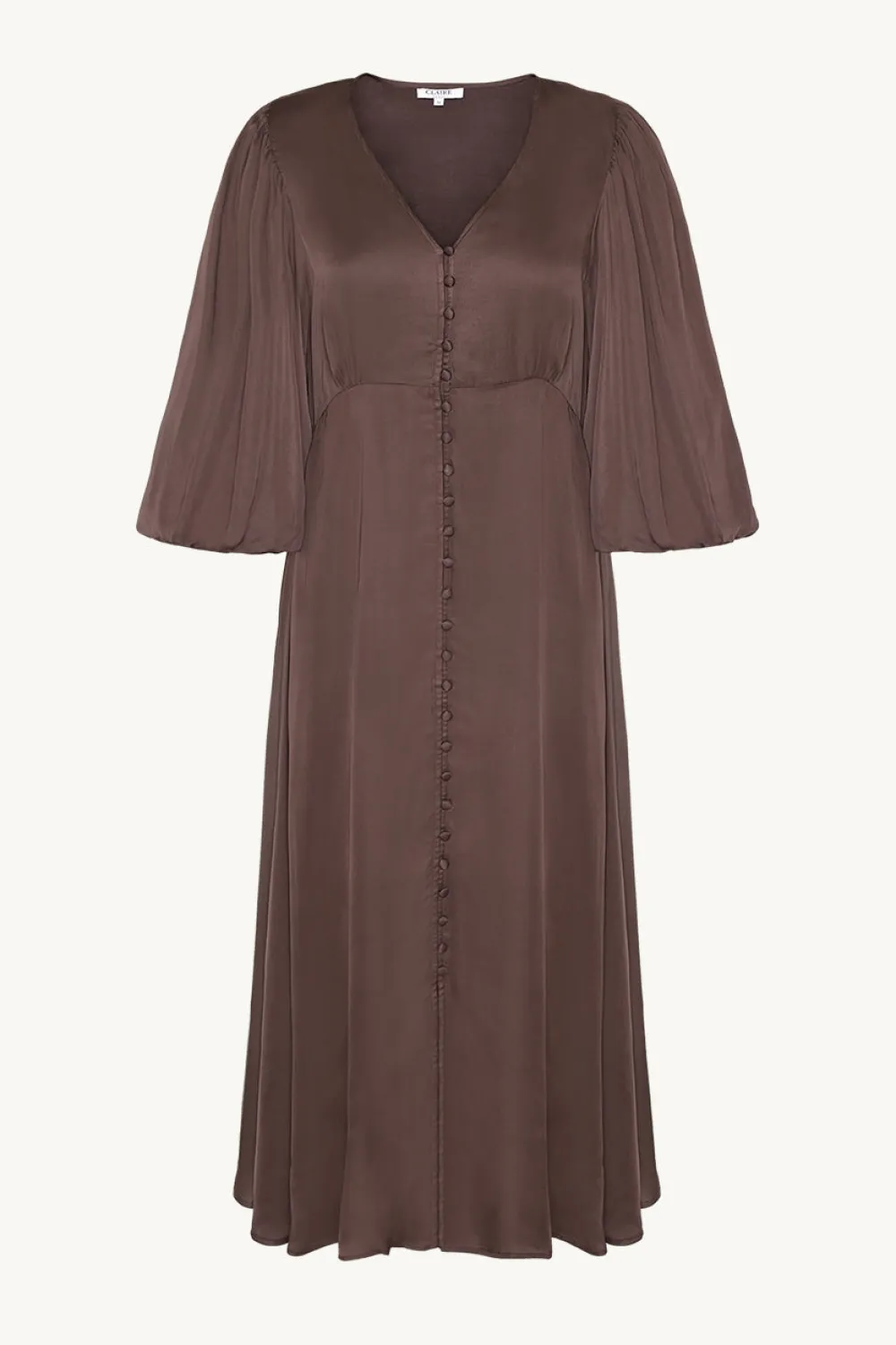 Anna juhla-asuusi eleganssia ja rohkeaa tyylikkyyttä—Claire Woman Dunia-mekko yhdistää lumoavan satiinin, kauniisti laskeutuvat volyymihihat ja naisellisen istuvuuden. Mekon yläosa on vartalonmyötäinen ja siinä on tyylikäs V-pääntie, joka korostaa kaula- ja decolté-aluetta. Leveä helma antaa kauniin, ilmavan liikkeen, ja napitus edessä lisää sävykkään detaljin, johon kuuluu lisäksi pieni halkio helman alaosassa. Napit on yhdistetty joustavaan kuminauhalenkkijärjestelmään, joka tekee pukemisesta helppoa ja mukavaa. Volyymihihat ovat muotoiltu niin, että ne näyttäisivät puhvihihallisilta, mutta laskeutuvat elegantisti ja miellyttävästi—täydellinen yhdistelmä näyttävyyttä ja käytännöllisyyttä. Kevyt viskoosivuori takaa miellyttävän tunnun ja sulavan liikkeen mekossa