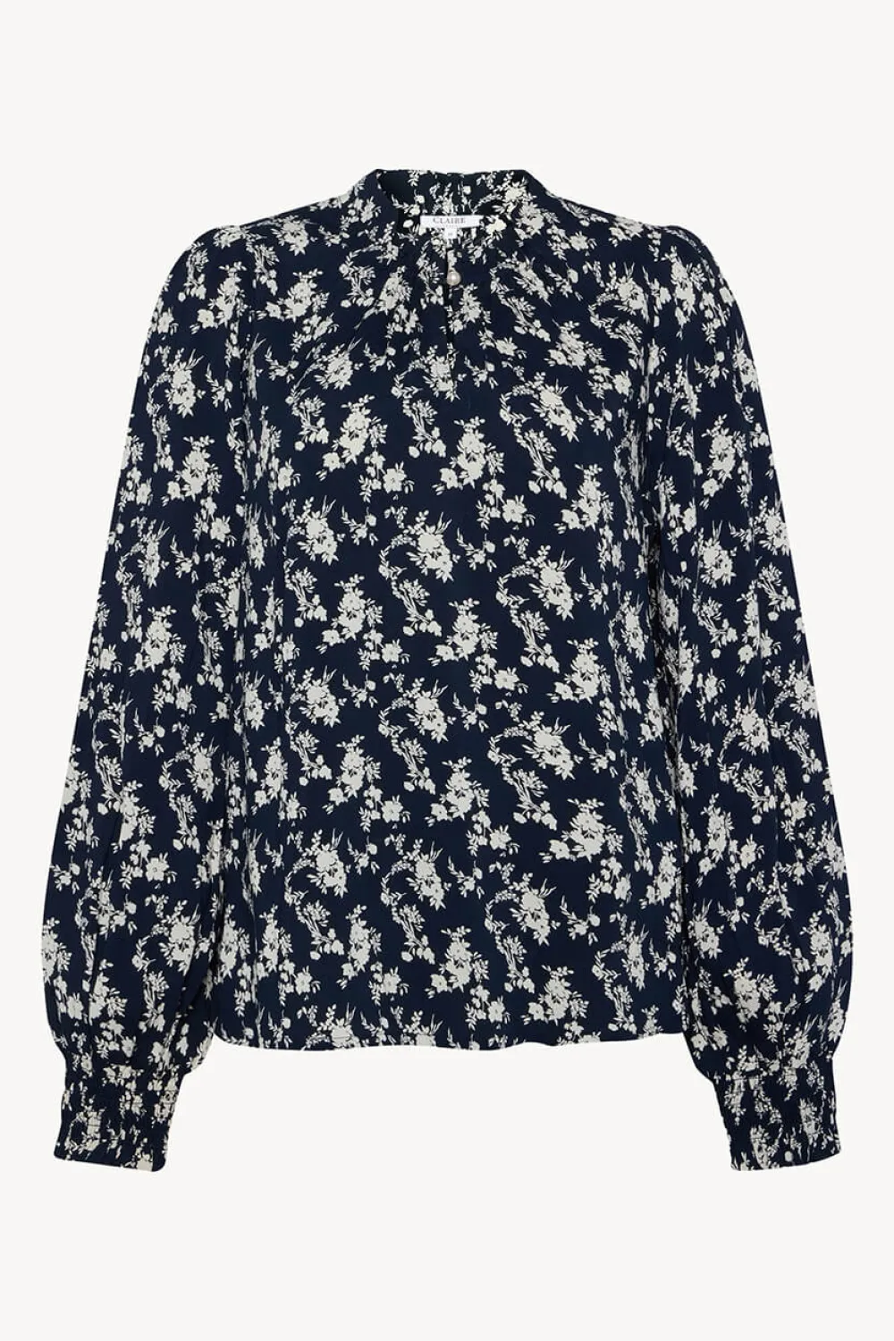 Paita kudottua viskoosia, jossa on kukkakuvio, laskokset ja nappikiinnitys niskassa. Paidassa on laskokset olkapäillä ja resori hihoissa sekä halkiot sivuissa.