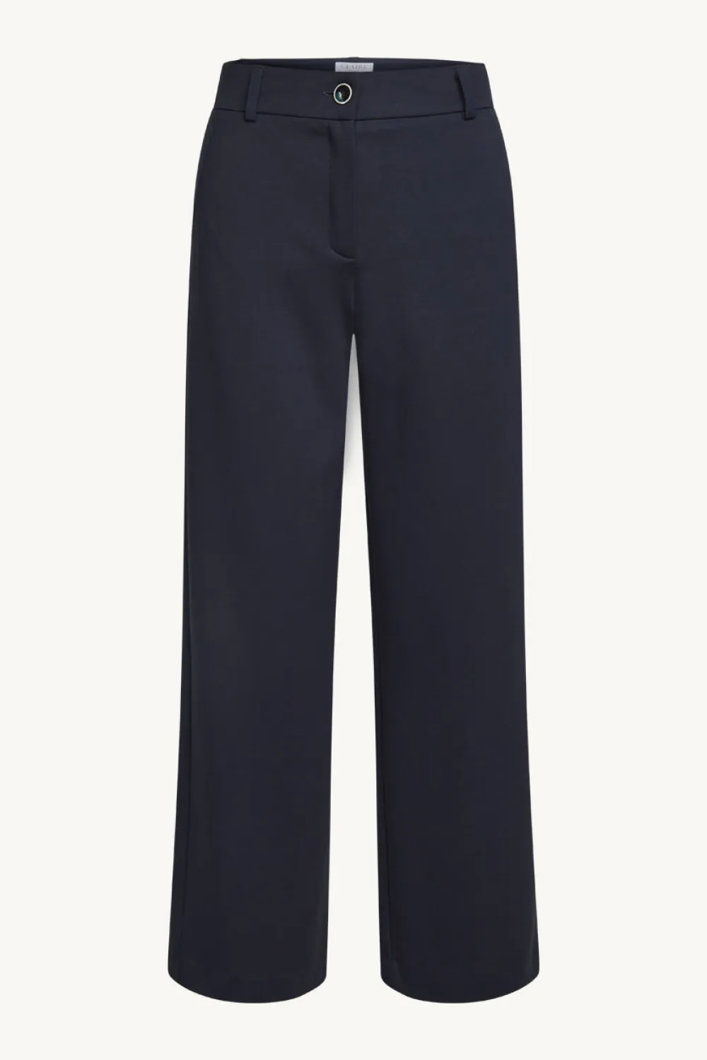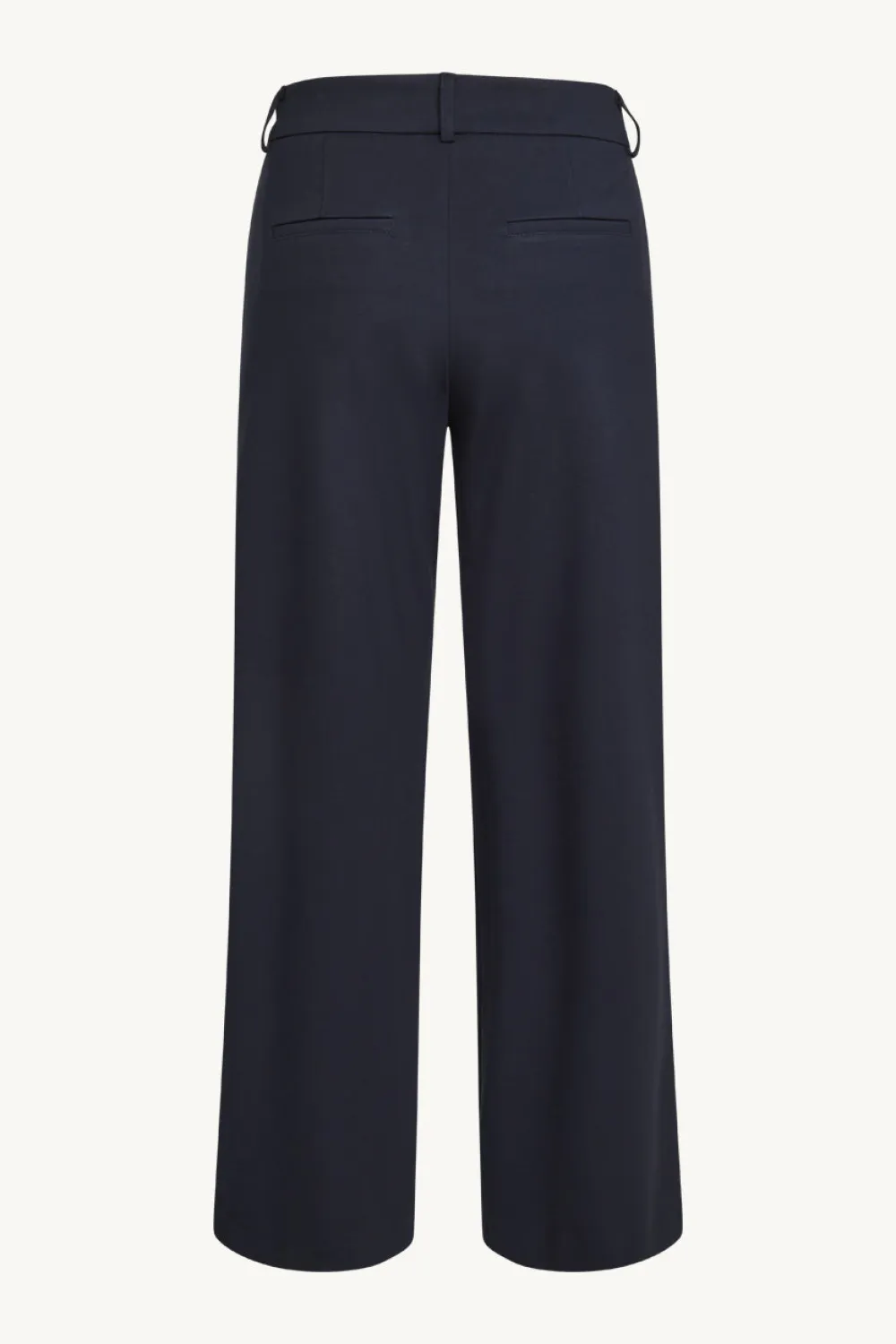 Klassiset housut, joissa leveät lahkeet ja vinot etutaskut. Housuissa on vyölenkit ja tekotasku takana.