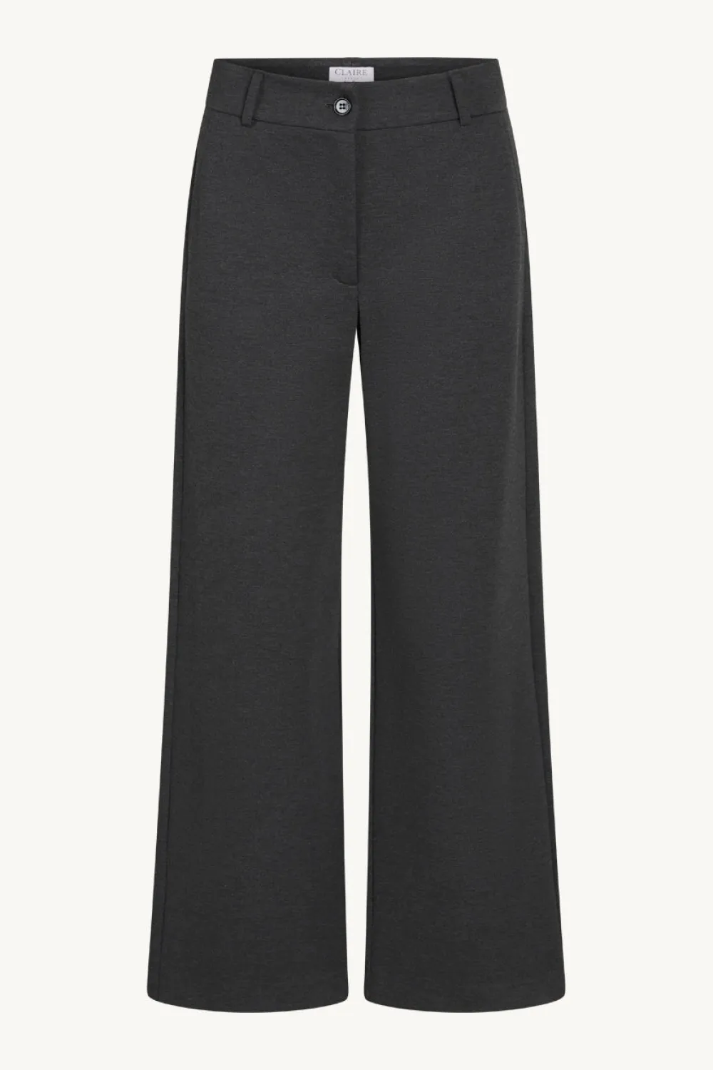 Klassiset housut, jossa on leveät lahkeet ja viistot etutaskut. Mallissa on vyölenkit ja valetasku takana.