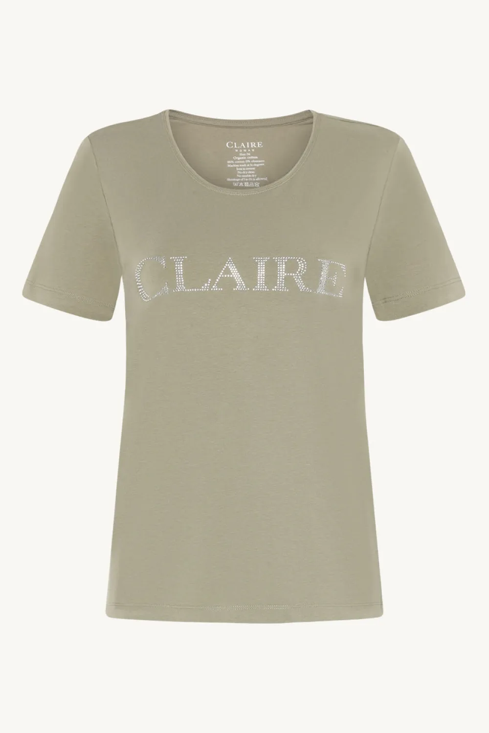 Naisten lyhythihainen t-paita pehmeää, joustavaa trikoota, rinnassa strasseilla tehty Claire-logo