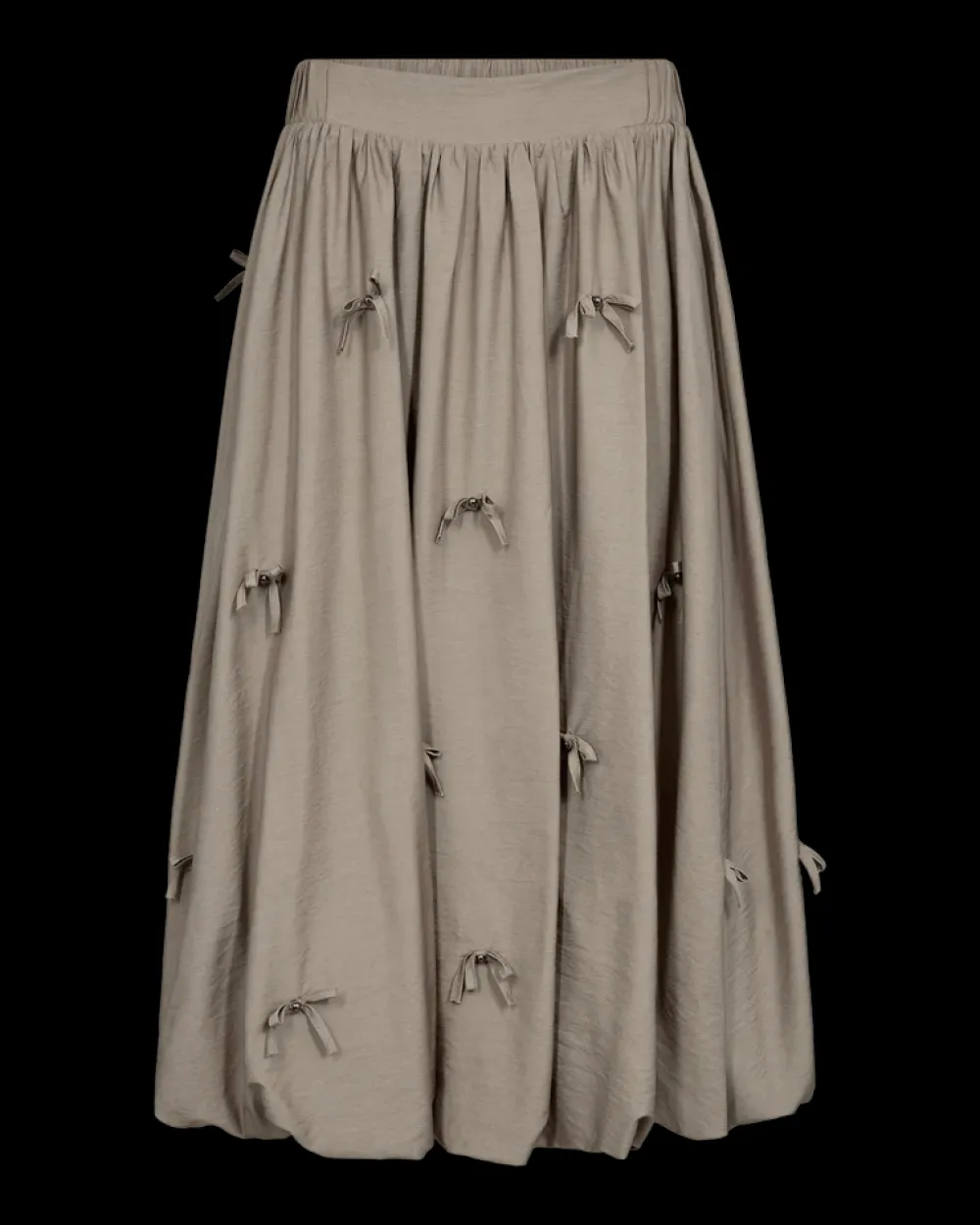Pitkä, pallomainen hame, joka huokuu romanttista eleganssia ja huolellista skandinaavista suunnittelua. Hame on valmistettu ylellisen pehmeästä ja laskeutuvasta premium-sekoitteesta, ja sen kaareva siluetti luo kevyen ja ilmavan efektin asuusi.