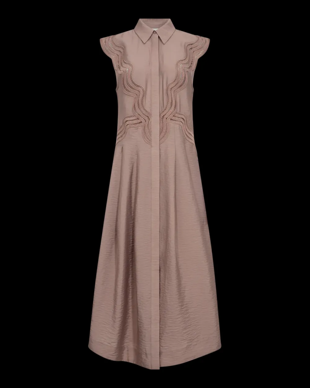 Copenhagen Muse CMCOLE-mekko on elegantti ja naisellinen valinta, joka yhdistää hienostuneet yksityiskohdat ja laadukkaat materiaalit. Mekossa on lyhyet hihat, piilotettu nappikiinnitys edessä sekä kauniita pitsileikkauksia, jotka tuovat asuun herkkyyttä ja tyylikkyyttä. Yläosan vartalonmyötäinen leikkaus korostaa vyötäröä, ja hameosassa on vuori, joka lisää käyttömukavuutta.