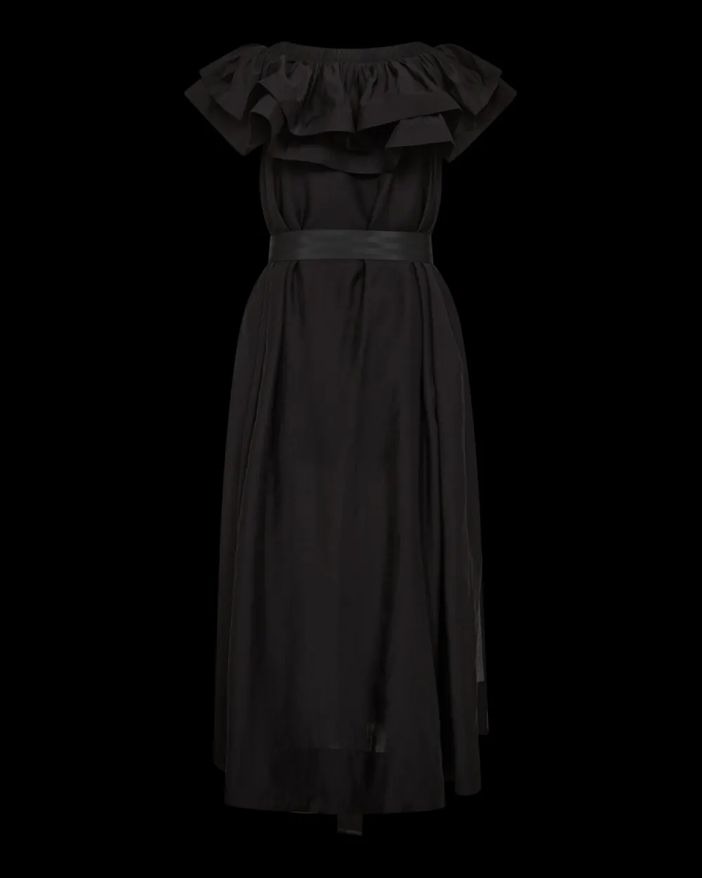 Kaunis ja ilmava kesämekko juhlaan ja arkeen. Kevyt kangas lisäävät käyttömukavuutta lämpimillä ilmoilla. Yläosassa röyhelöt ja kuminauhakiristys.