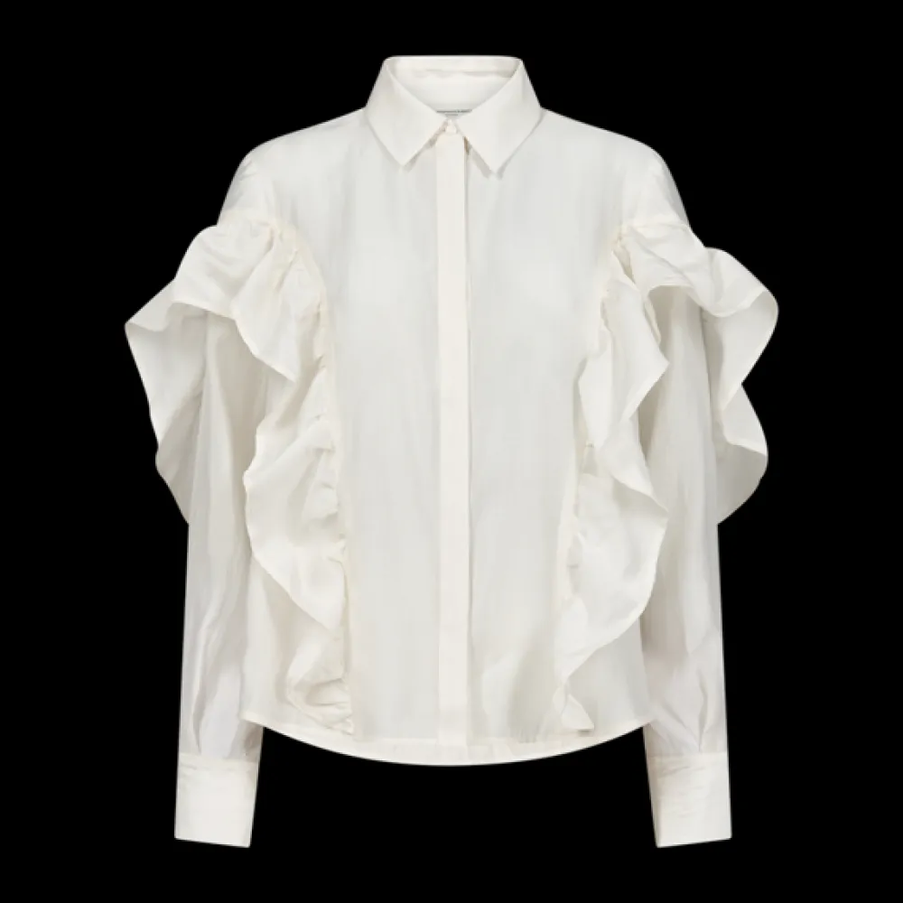 CMMOLLY-PAITA on ensiluokkaisesta materiaalista valmistettu paita, jossa on piilonapitus edessä, siro kaulus ja pitkät hihat, joissa on elegantit, suuret röyhelöt.