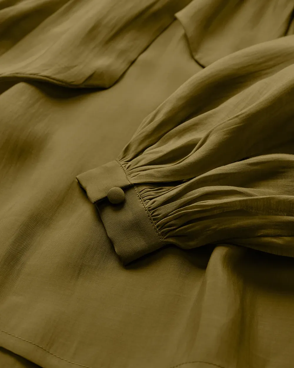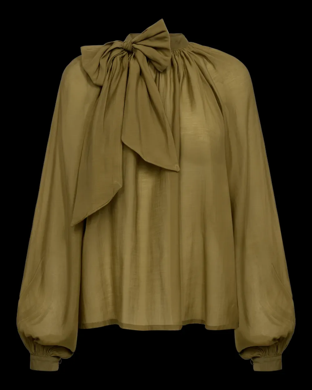 CMTILLY-BLOUSE on eksklusiivinen pusero, jossa on ylellinen, irrotettava rusettikoriste korkeassa kauluksessa, laskostetut yksityiskohdat, kangasnapeilla koristeltu halkio takana ja pitkät raglanhihat, joissa on runsas ilmapalloefekti ja nappikiinnitys.
