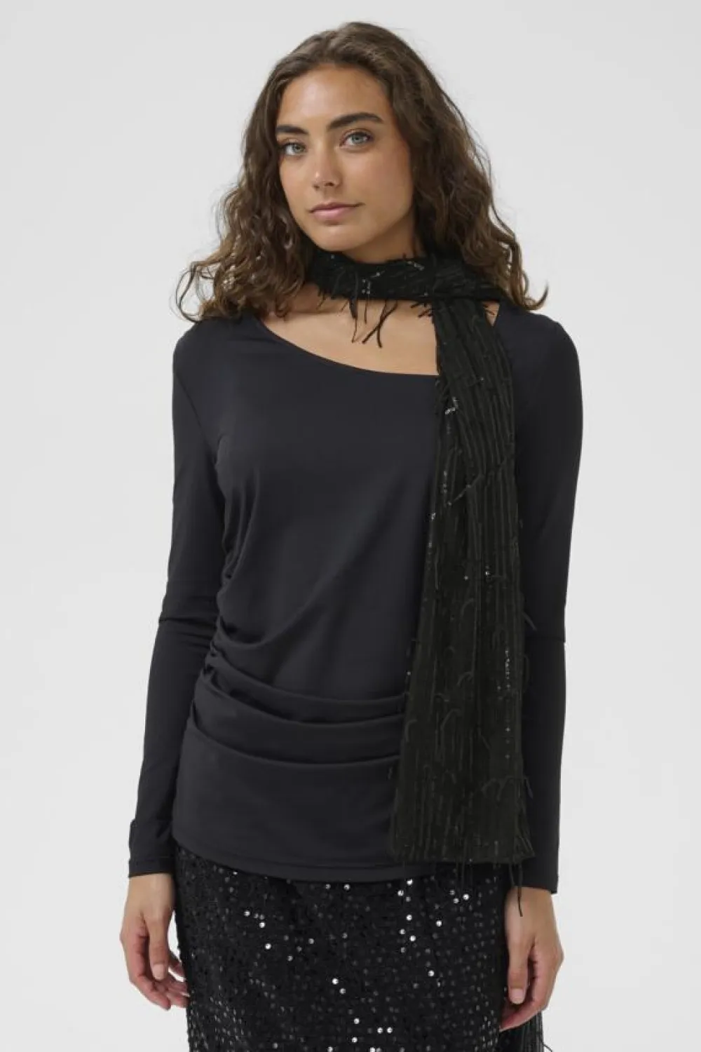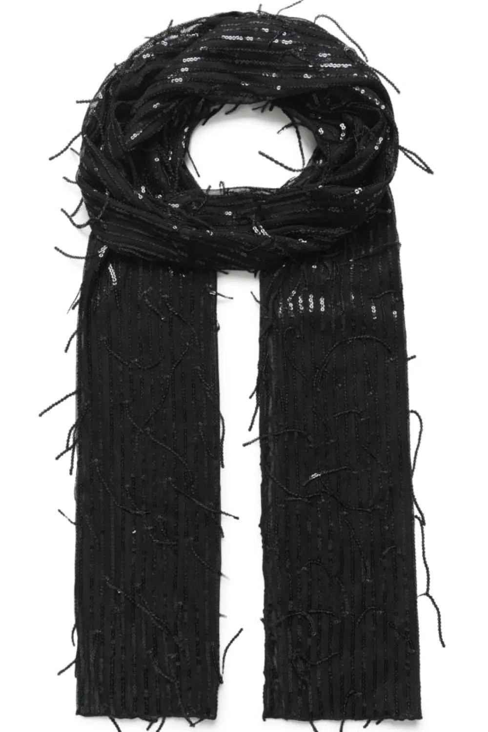 Tämä elegantti huivi on kevyt ja mukavan istuva, ja siinä on hienovaraista kimallusta paljeteilla. Suorakulmainen muoto ja teksturoitu yksityiskohta lisäävät hienostunutta tyyliä tehden siitä monipuolisen asusteen eri tilaisuuksiin.
