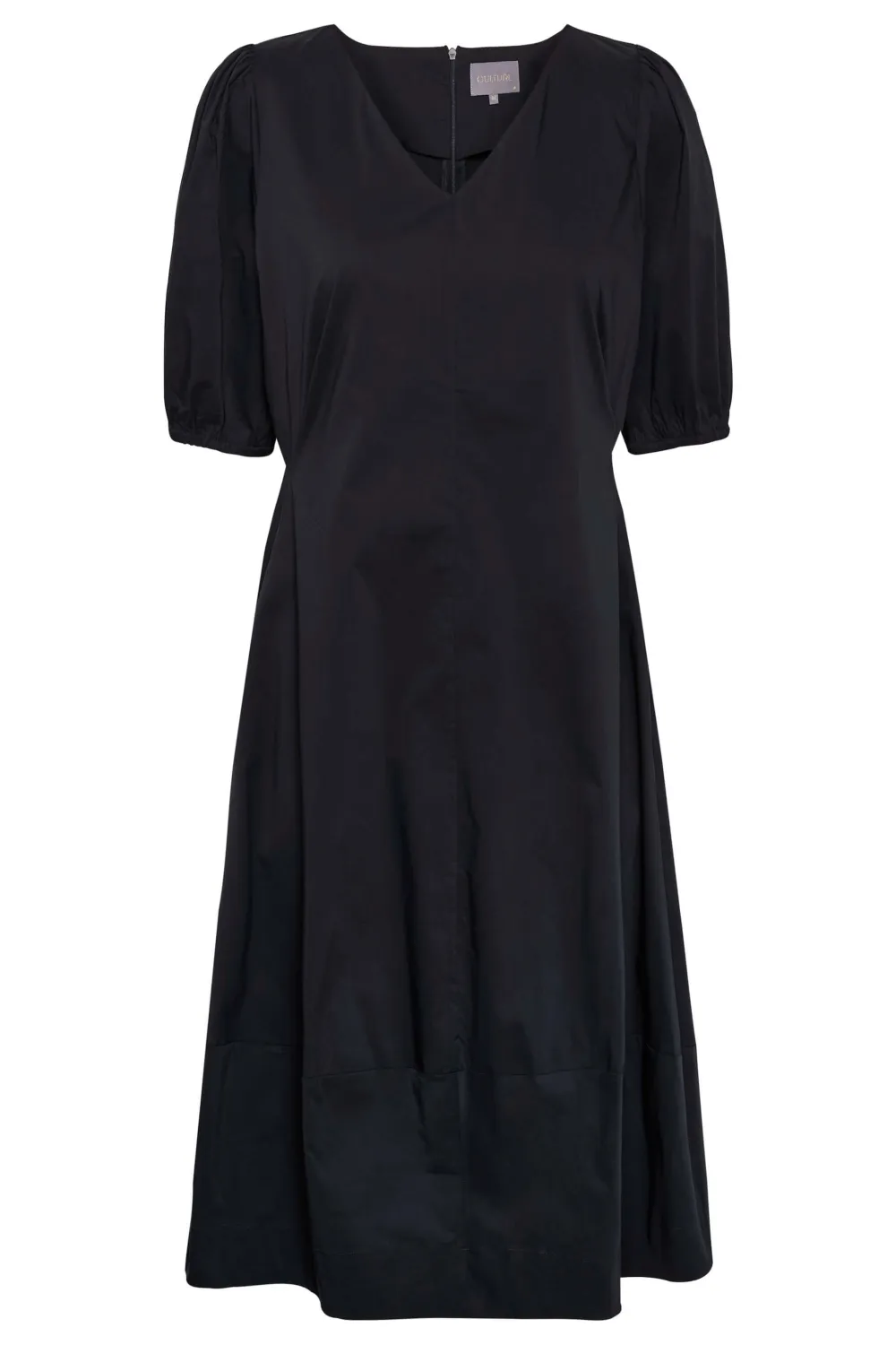 Culturen kauniissa mekossa on miellyttävä joustava materiaali. .Mekossa lyhyet puhvihihat, vetoketjukiinnitys selässä sekä taskut. Hieman levenevä helma joka laskeutuu kauniisti. Kaunis v- pääntie. Sopii sekä arkisempaan kuin juhlavampaankin käyttöön.