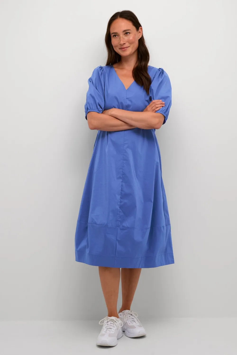 Culturen kauniissa mekossa on miellyttävä joustava materiaali. .Mekossa lyhyet puhvihihat, vetoketjukiinnitys selässä sekä taskut. Hieman levenevä helma joka laskeutuu kauniisti. Kaunis v- pääntie. Sopii sekä arkisempaan kuin juhlavampaankin käyttöön.