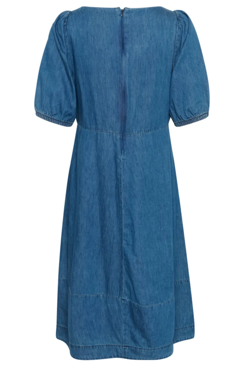 Midi mittainen denim mekko, jossa on joustavat hihansuut, jotka luovat kauniin pallomaisen vaikutelman. Mekossa on hienovaraiset saumat sivulla ja takana, mikä korostaa imartelevaa ja naisellista siluettia.
