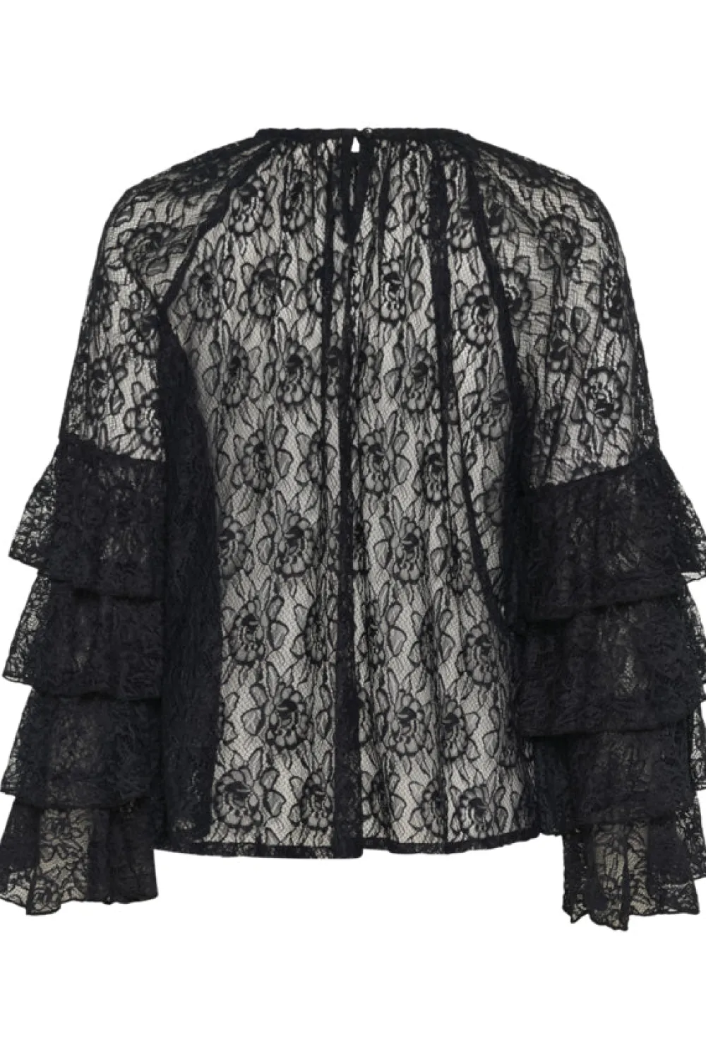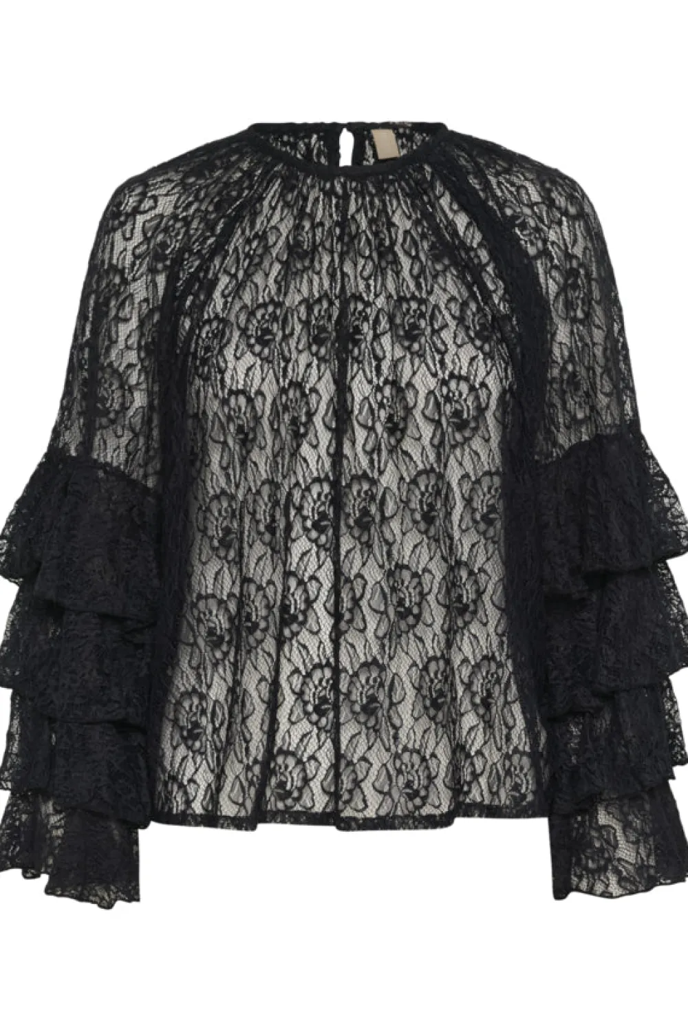Pitsipusero, jossa on kerrostetut röyhelöhihat, tarjoaa rennon istuvuuden, pyöreän pääntien ja kevyen mukavuuden. Monipuolinen ja näyttävä toppi, joka sopii täydellisesti päivittäiseen tyyliisi eleganteilla ja naisellisilla yksityiskohdilla.
