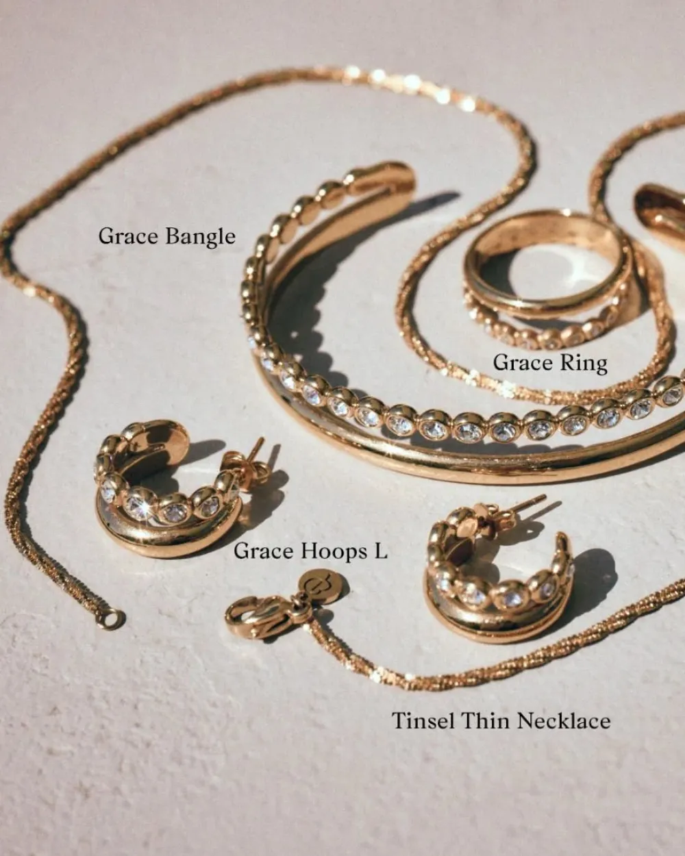 Grace-sarjan korut ovat klassisia modernilla otteella. Erittäin tyylikäs ja helppokäyttöinen sarja, jossa yksinkertaisuus yhdistyy glamouriin ja joka sopii juhlaviin tilaisuuksiin, kun haluat hieman lisäkimallusta. Tässä hieman suuremmat korvarenkaat 14 karaatin kultauksella ja kahdella rungolla, joista yhdessä on kimaltavia kiviä ja toisessa ei. Ne näyttävät siltä kuin korvissa olisi kahdet korvakorut. Sopivat hyvin yhdistettäväksi sarjan rannerenkaan tai sormuksen kanssa.