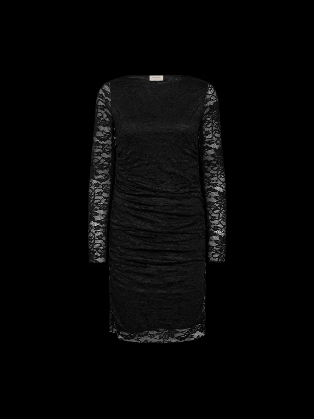 Freequent-merkkinen mekko kauniista pitsistä, jossa on kukkakuvio ja koko vartalon peittävä vuori. Lisäksi mekossa on kapea istuvuus, pitkät hihat, elegantti venepääntie sekä rypytettyjä yksityiskohtia sivulla.
