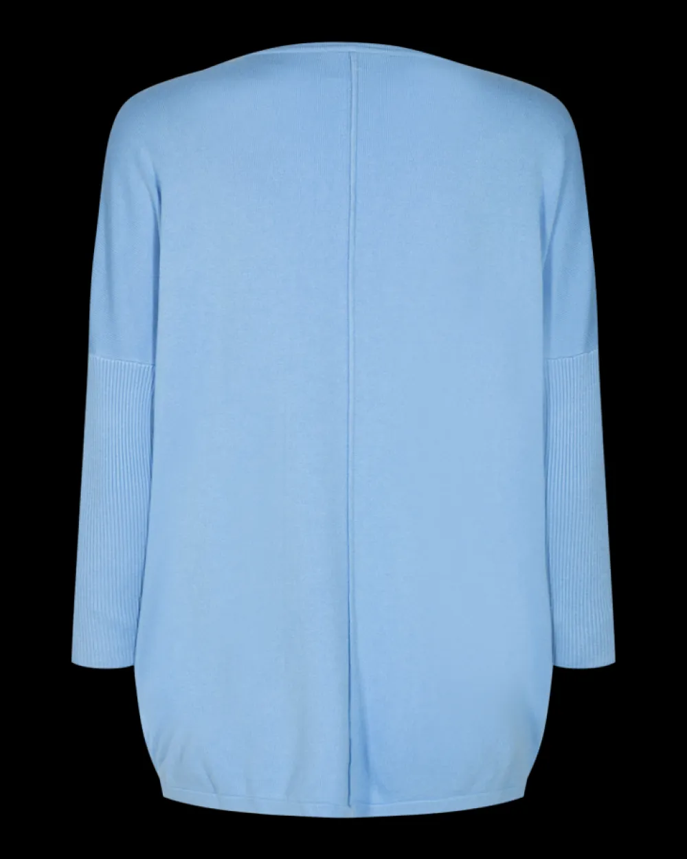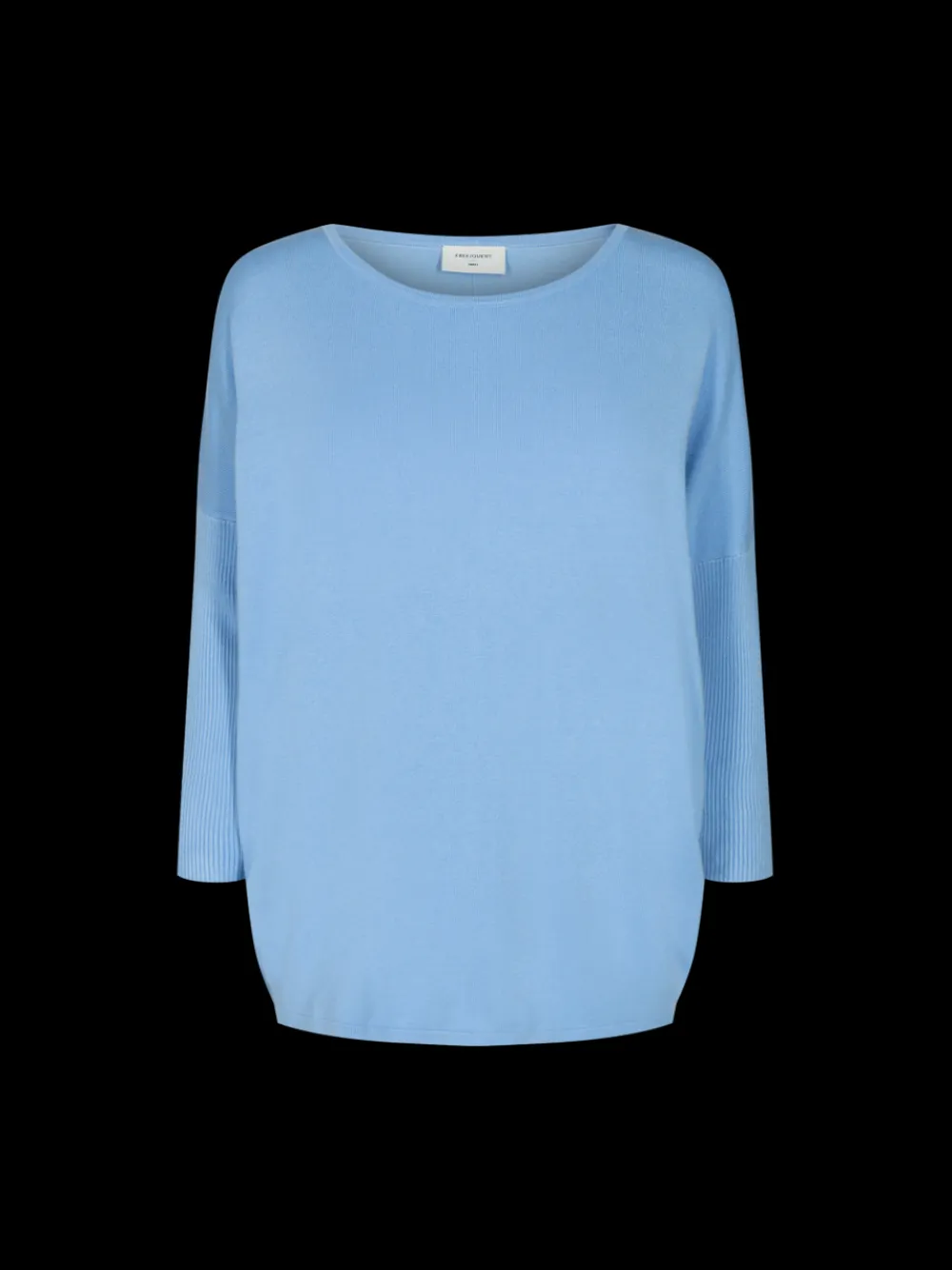 Freequentin yksivärinen neulepusero vajaamittaisilla ribneuloshihoilla. O-pääntie, malliltaan kapenee helmaan. Koossa S pituus n.65 cm.