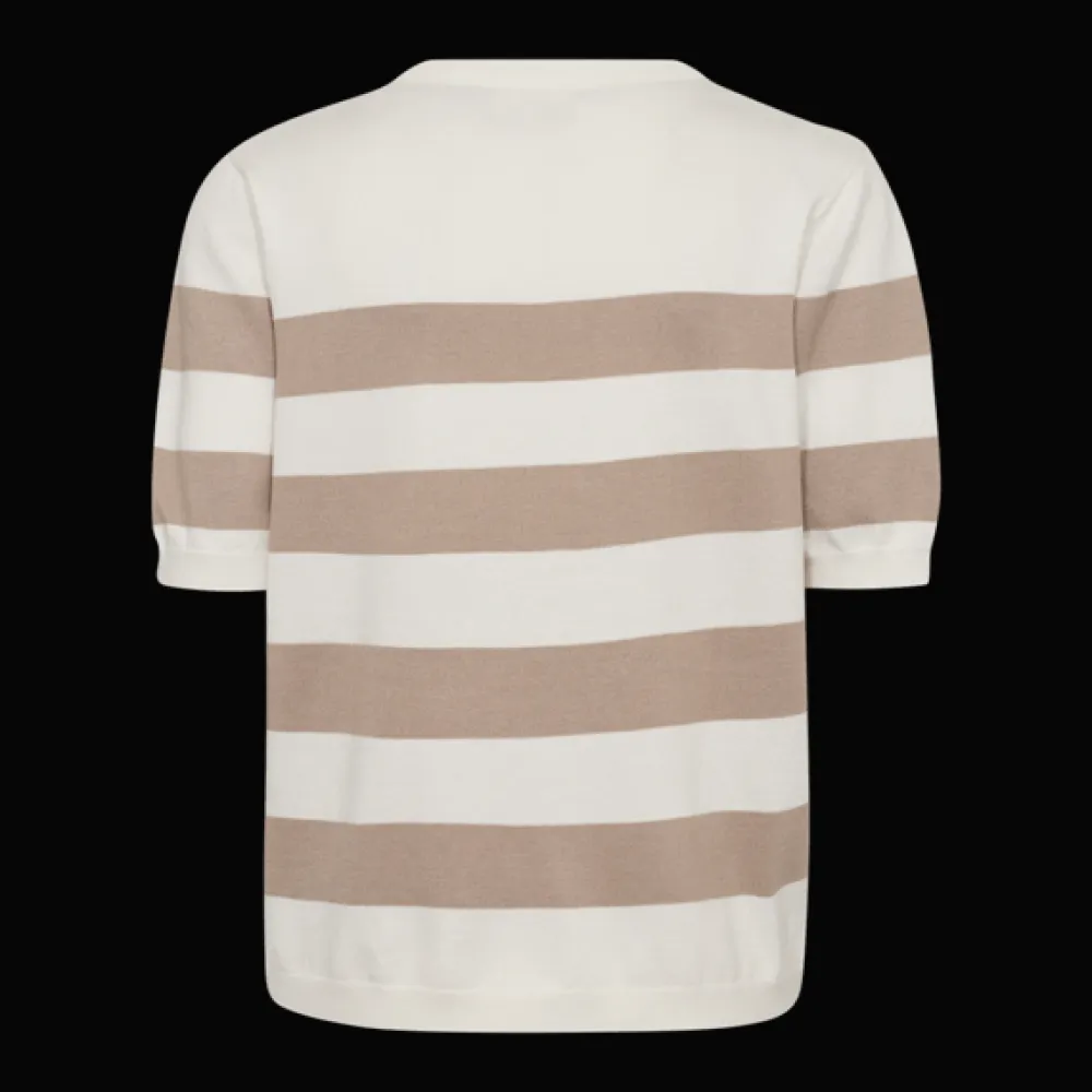 Freequent-neulepusero pehmeää, ohutta materiaalia, jossa on leveä raidallinen kuvio. Neulepuserossa on yksinkertainen siluetti, lyhyet hihat, pyöristetty pääntie, resori ja tyylikäs, rento malli.