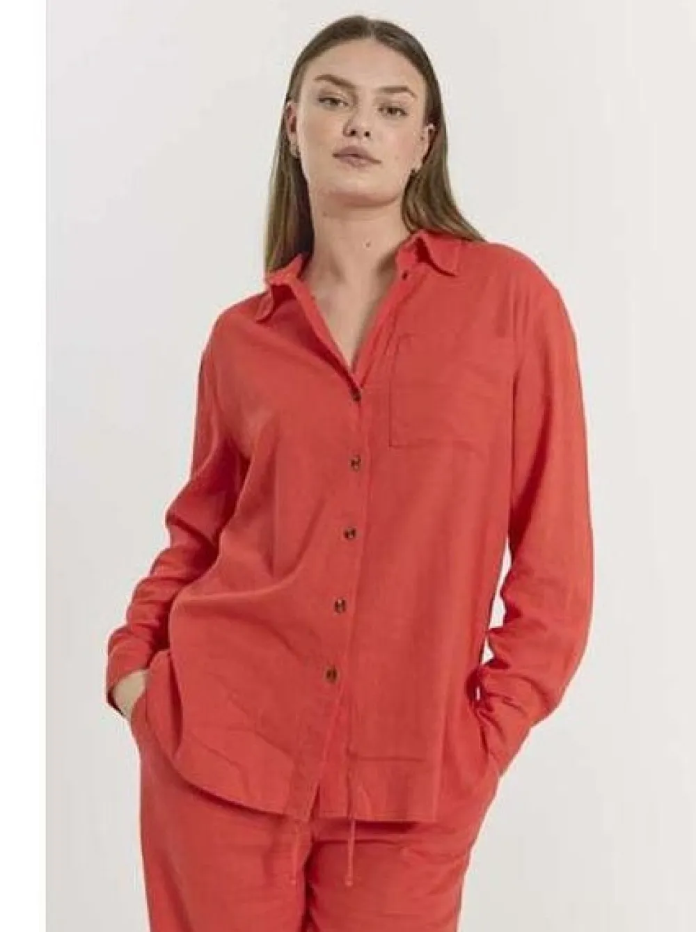Viileän tuntuinen ja hengittävä pitkähihainen naisten kangaspaita. Paitakaulus, edessä napitus ja hihansuissa napilliset kalvosimet. Yksi rintatasku. Sivuilla helmassa halkiot. Takana kaarrokkeen reunassa vastalaskos väljyysvarana. Kutistuu mahdollisesti 5% pesussa.