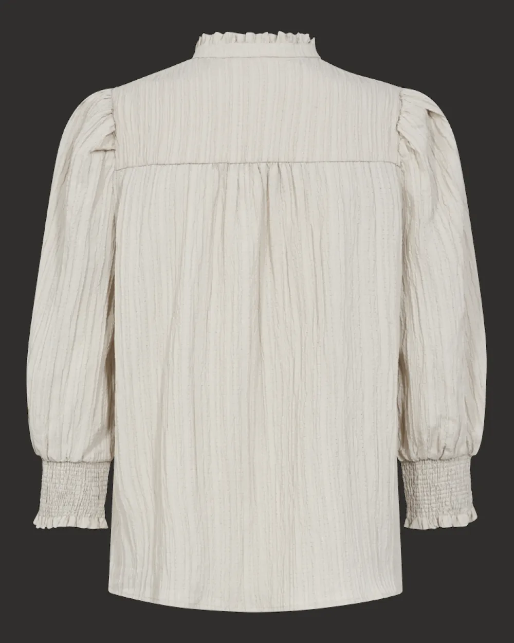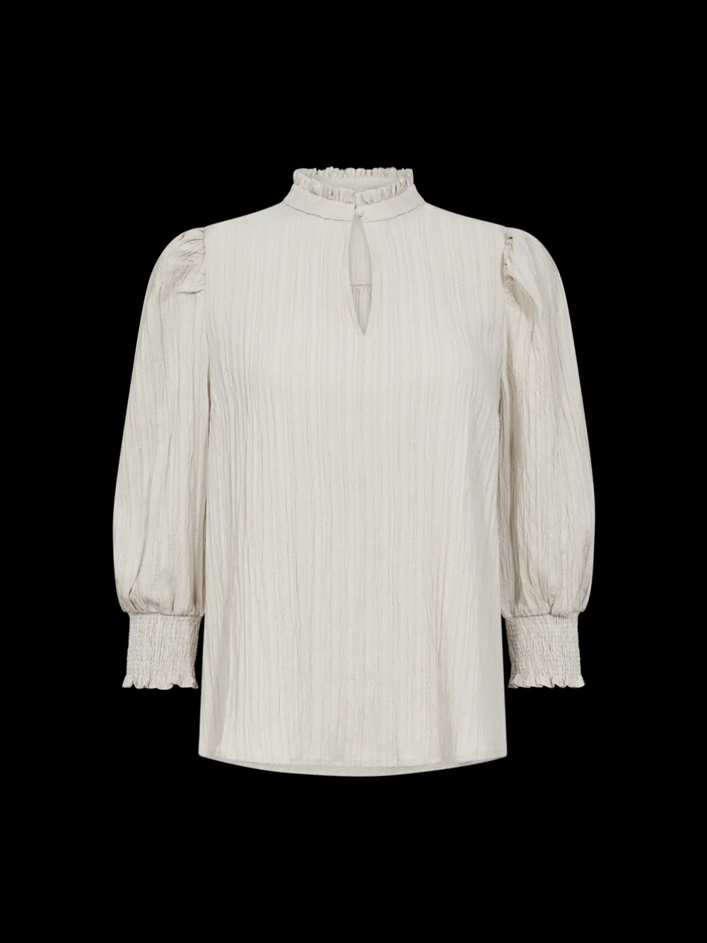 Hienovaraisesti struktuuripintainen kangas tuo ilmeeseen syvyyttä ja hillittyä elävyyttä. Pieni pystykaulus ja rypytetyt hihansuut viimeistelevät lookin klassisella, mutta modernilla otteella.