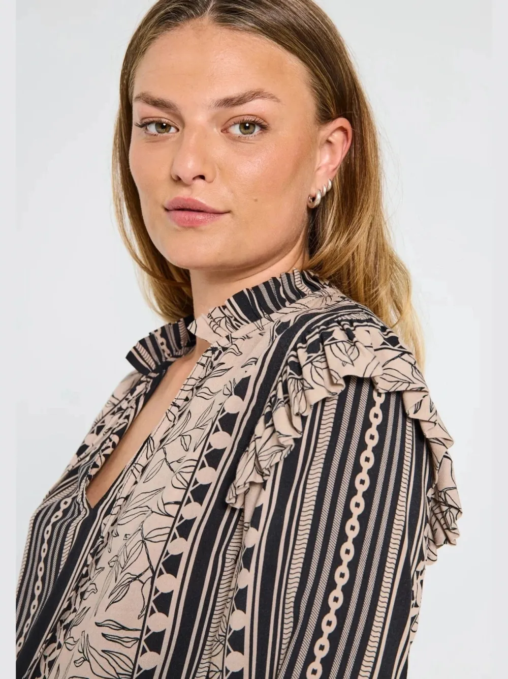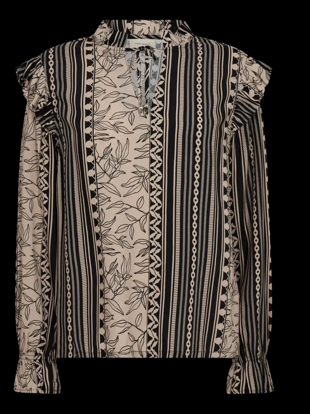 Freequentin pusero kauniissa kuosissa. Kevyt materiaali, casual fit istuvuus, v-kaula-aukko ja pitkät pallohihat.