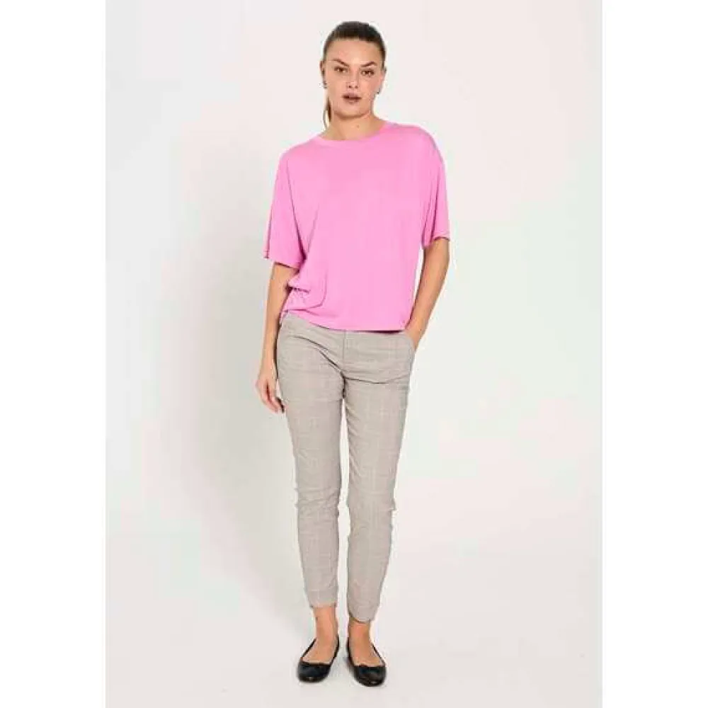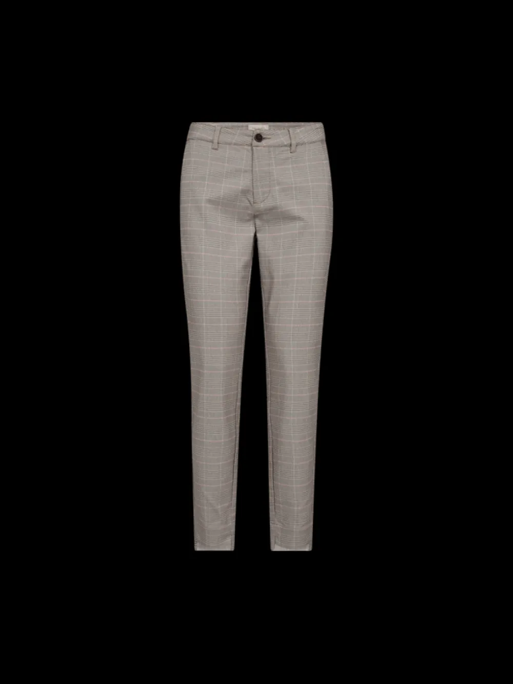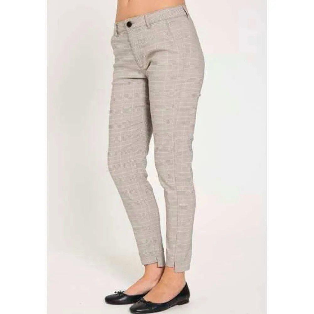 Freequentin housut pehmeästä ja joustavasta materiaalista, jossa ruudullinen printti. Housuissa on yksinkertainen siluetti vetoketjulla ja nappikiinnitys, vinot sivutaskut, kapea istuvuus ja halkio nilkkapituisissa housujen lahkeissa.