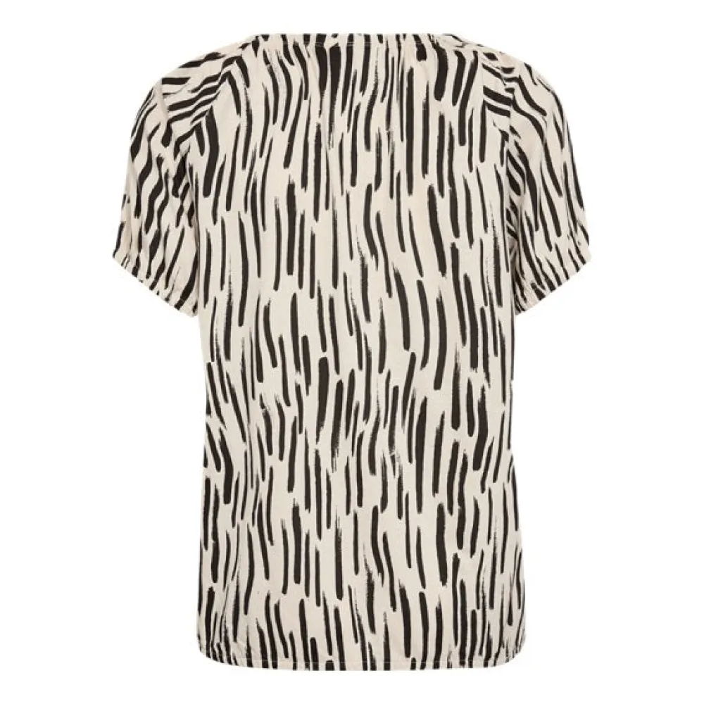 Kuosillinen t-paita muutamalla koriste napilla, avaralla pääntiellä ja hillityillä puhvihihoilla.
