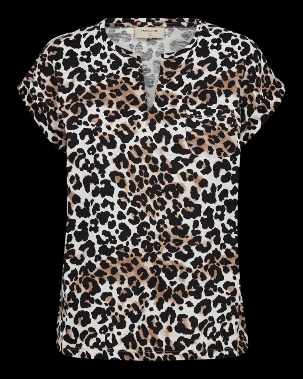 Freequent-t-paita pehmeästä materiaalista, jossa leopardikuvio. T-paidassa on yksinkertainen siluetti, jossa on V-pääntie, lyhyet käännetyt hihat, yksi rintatasku ja ihana, rento malli.