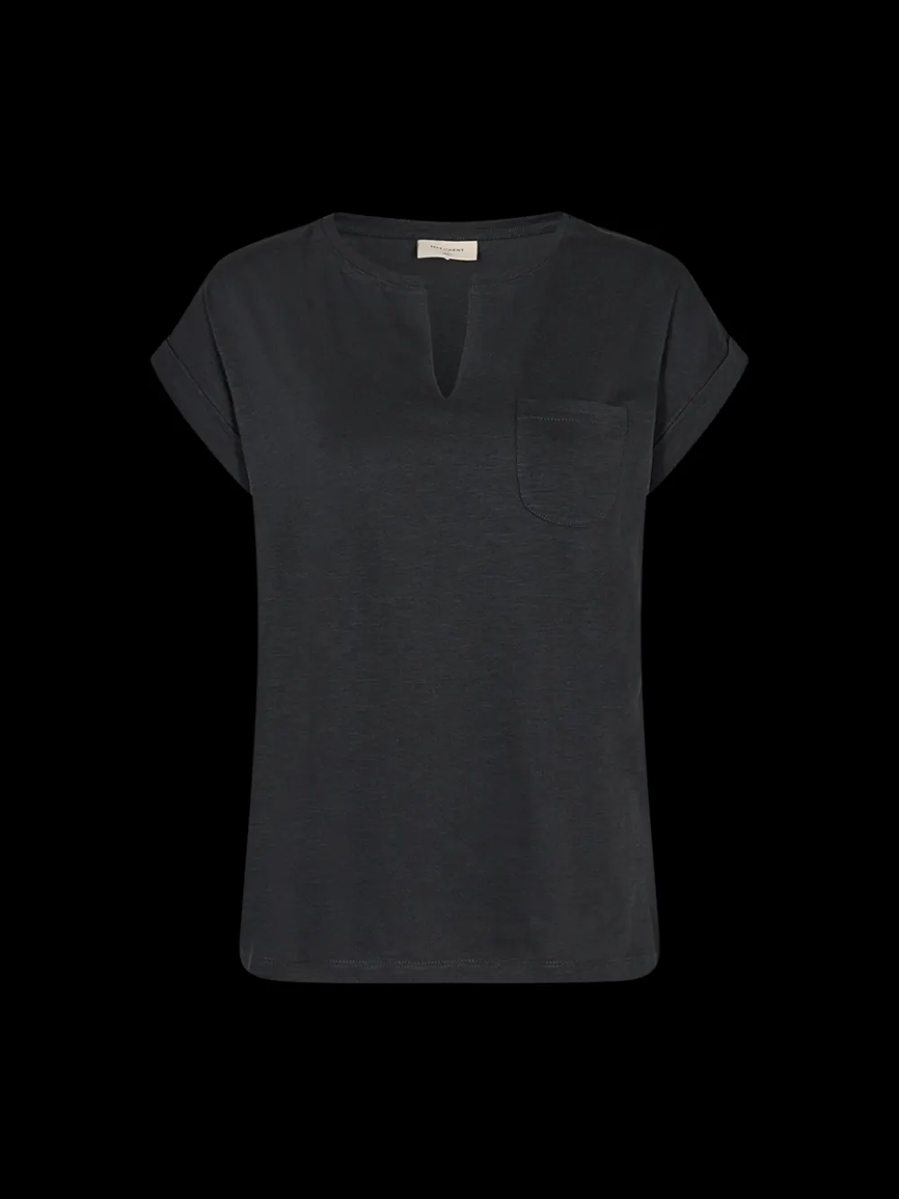 Naisten lyhythihainen t-paita. Pyöreä pääntie, edessä pieni halkio. Hihansuiss akäänteet.