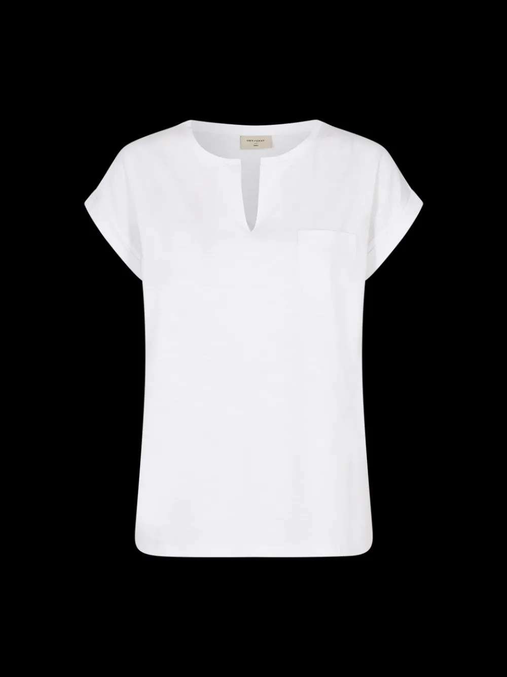 Naisten lyhythihainen t-paita. Pyöreä pääntie, edessä pieni halkio. Hihansuiss akäänteet.