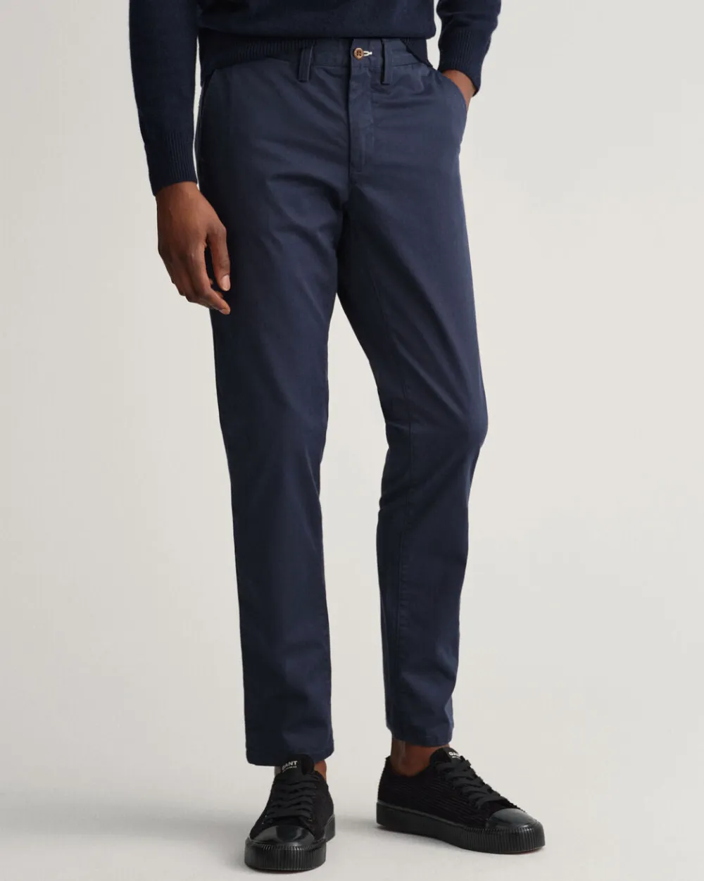 Kapea mitoitus Normaali vyötärö ja kapeat lahkeet Mukavan joustavat Takana olevan teretaskun yläpuolella kudottu GANT-merkki Malli on 189 cm pitkä ja käyttää kokoa 32/32