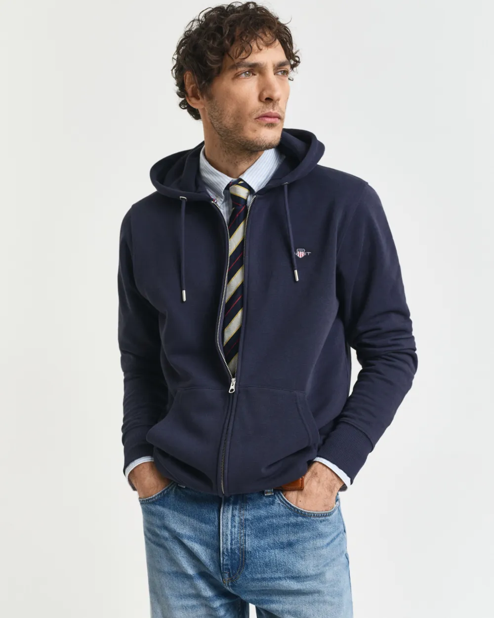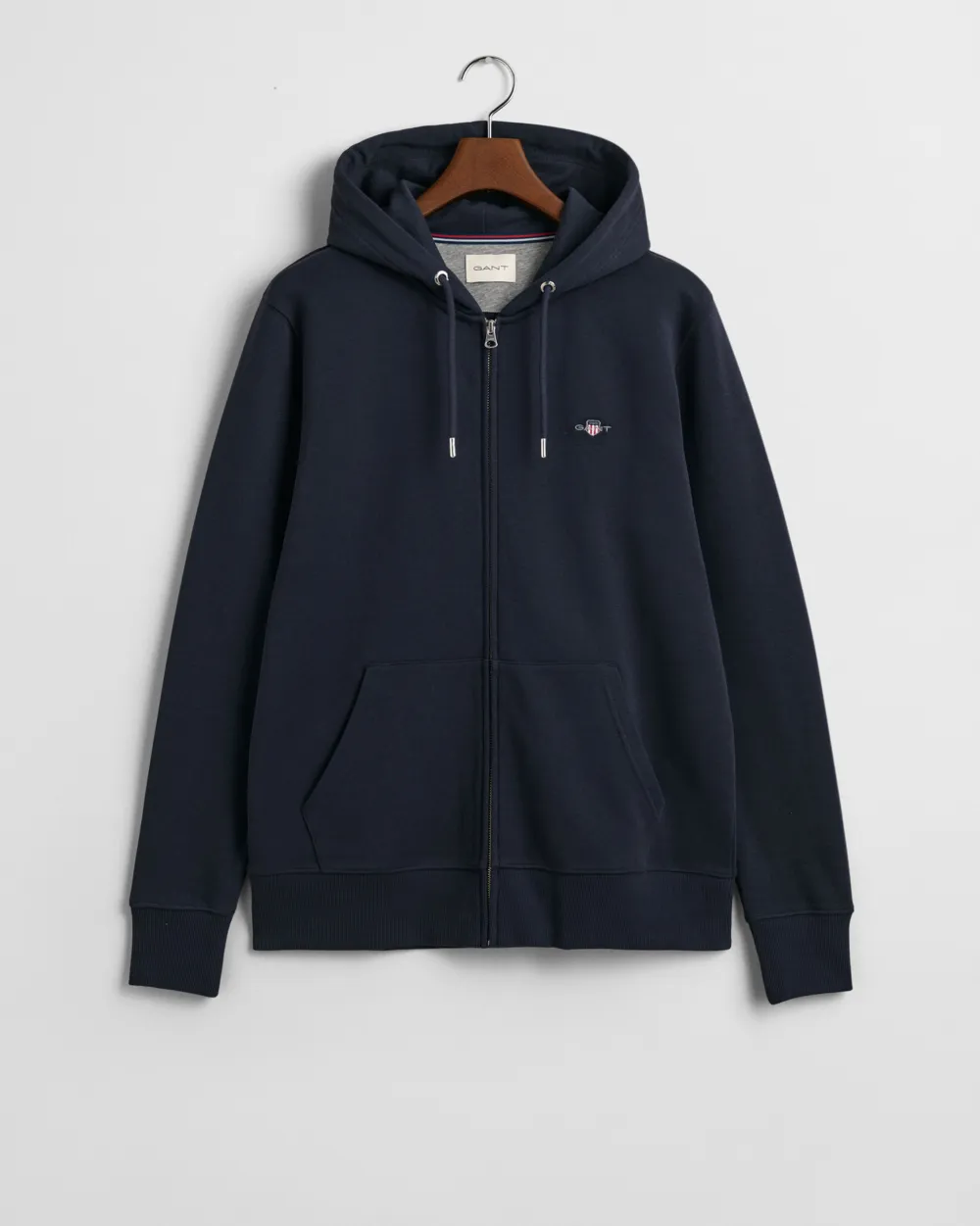 Hupparissa on pieni kirjailtu vaakunakuvio rinnassa, kokopitkä vetoketju sekä kengurutasku edessä.