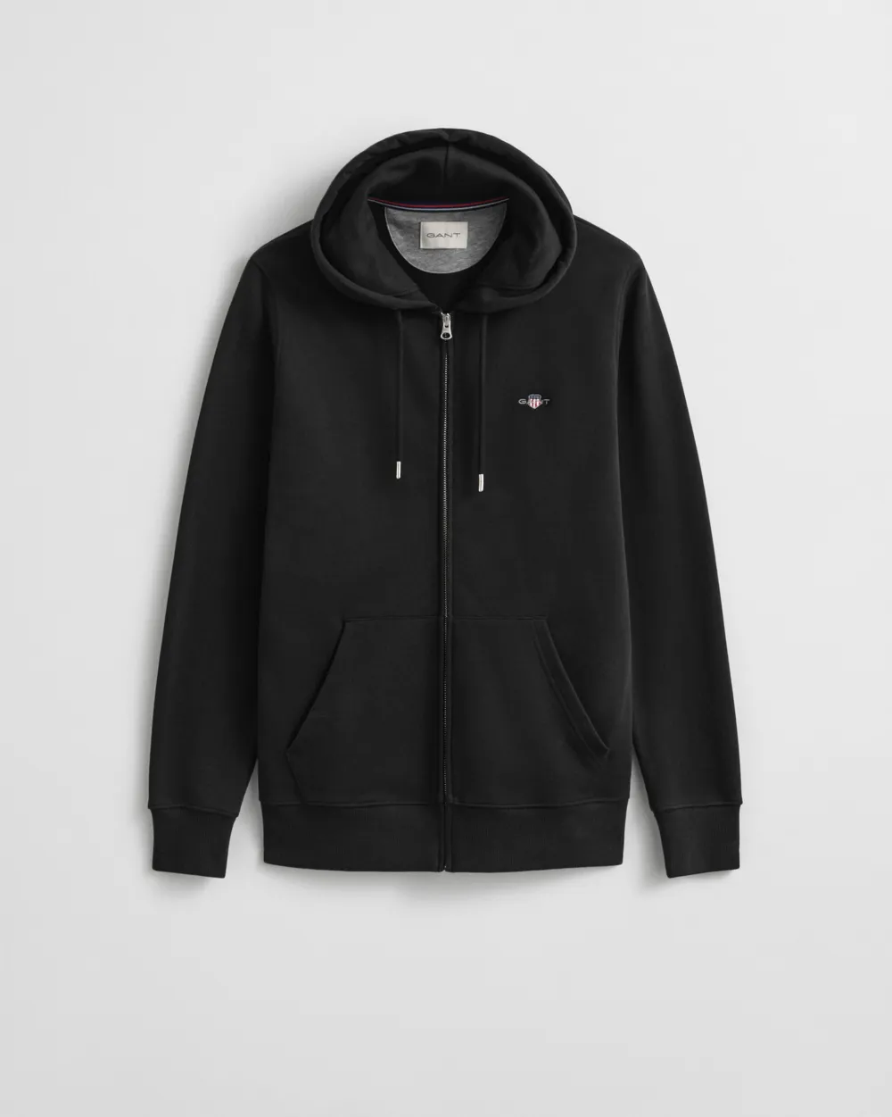 K SHIELD FULL ZIP HOODIE MUSTA on Gantin vetoketjuhuppari. Mallissa on kokopitkä vetoketju, huppu kiristysnauhalla, kengurutaskut ja pienikokoinen kirjailtu logo rinnassa. Suora leikkaus ja pehmeä sisäpinta tekevät siitä mukavan arki- ja vapaa-ajan valinnan.