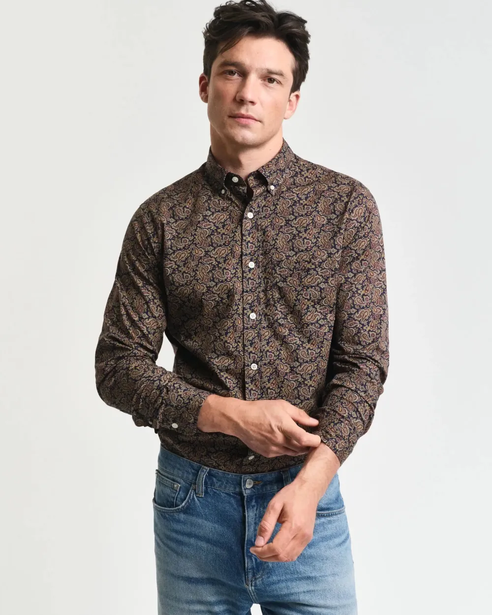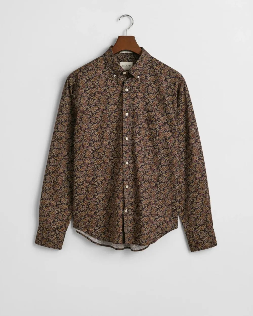 Tässä klassisessa popliini paidassa on regular fit ‑mitoitus ja paisley-printtikuosi. Malliin kuuluu nappikaulus sekä rintataskuun kirjailtu GANT-vaakunakuvio, kierrätyspolyesterinapit sekä takana vastalaskos, jossa on GANTin perinteinen ripustuslenkki.