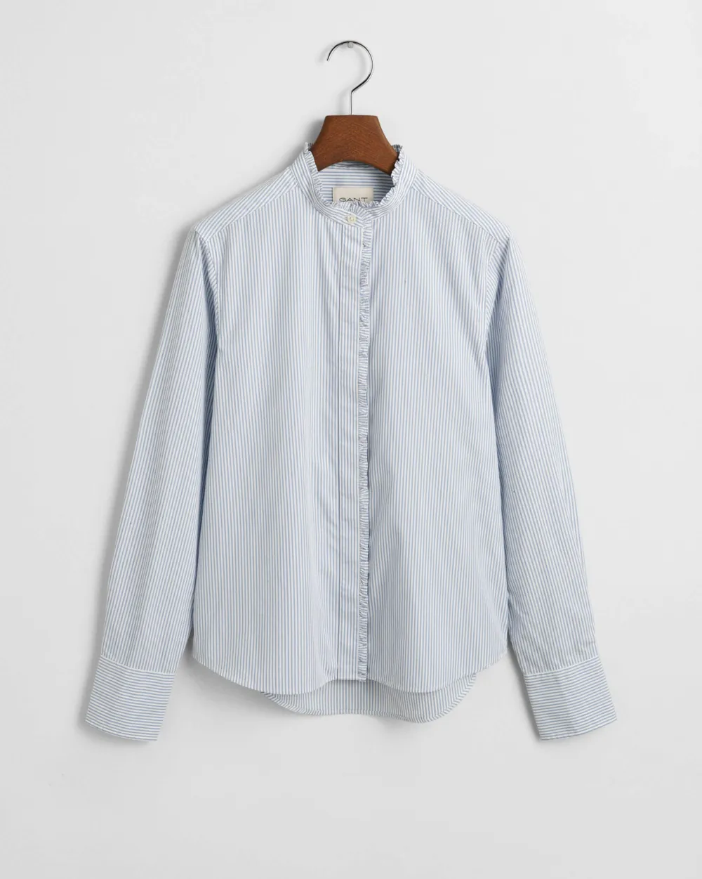 Tässä sataprosenttisesta puuvillasta valmistetussa paidassa on regular fit ‑mitoitus ja lankavärjätyt raidat. Siinä on lisäksi pystykaulus, piilotettu ja koristeröyhelöin koristeltu nappilista, pyöristetty helma ja laskokset hihansuissa.
