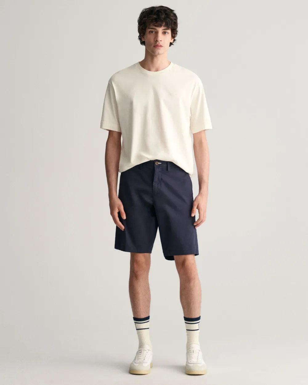Päällinen: 61 % luomupuuvillaa, 37 % puuvillaa, 2 % elastaania. Taskujen vuori: 100 % puuvillaa.