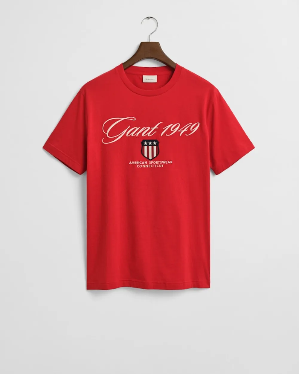 Tämä miesten malli on valmistettu 100 % luomupuuvillasta, tarjoten kestävästi tuotetun ja hengittävän vaatekappaleen arkeen. T-paidassa on pyöreä resoripääntie, lyhyet hihat ja rinnassa suurikokoinen GANT-graafinen printti, joka tuo ilmettä. Istuvuus on Regular Fit, mikä takaa mukavan ja suoraviivaisen siluetin.