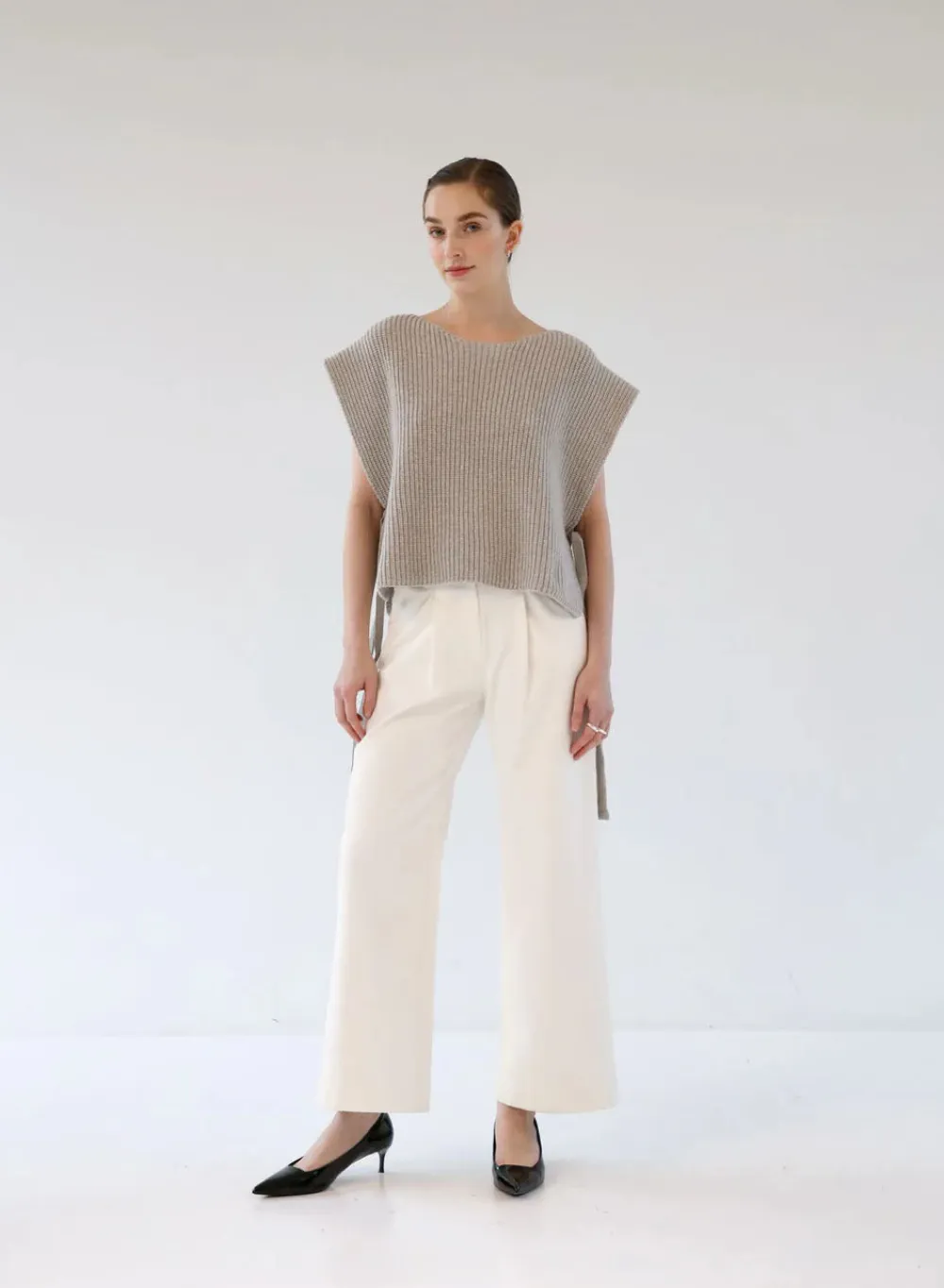 Kotimaisen Gauharin merinovillainen neuleliivi, jossa laatikkomainen malli ja pyöreä pääntie. Liivi on sivuilta avoin ja solmittavissa nauhoilla. Valmistettu Suomessa..