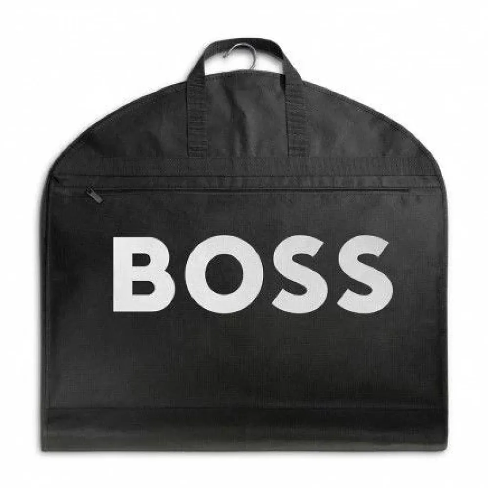 Hugo Boss musta pukupussi. Takana pitkä vetoketju ja nepparit, joilla pussin saa kätevästi taitettua. Etupuolella vetoketjullinen iso tasku, kantokahvat. Koko: 66x125x5 cm.