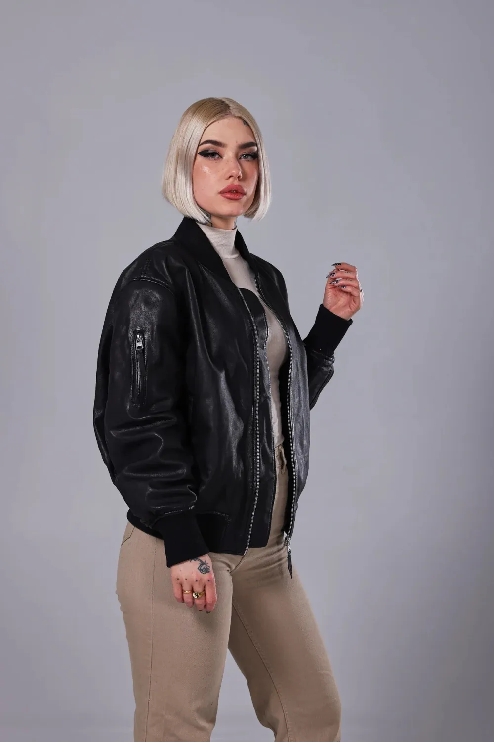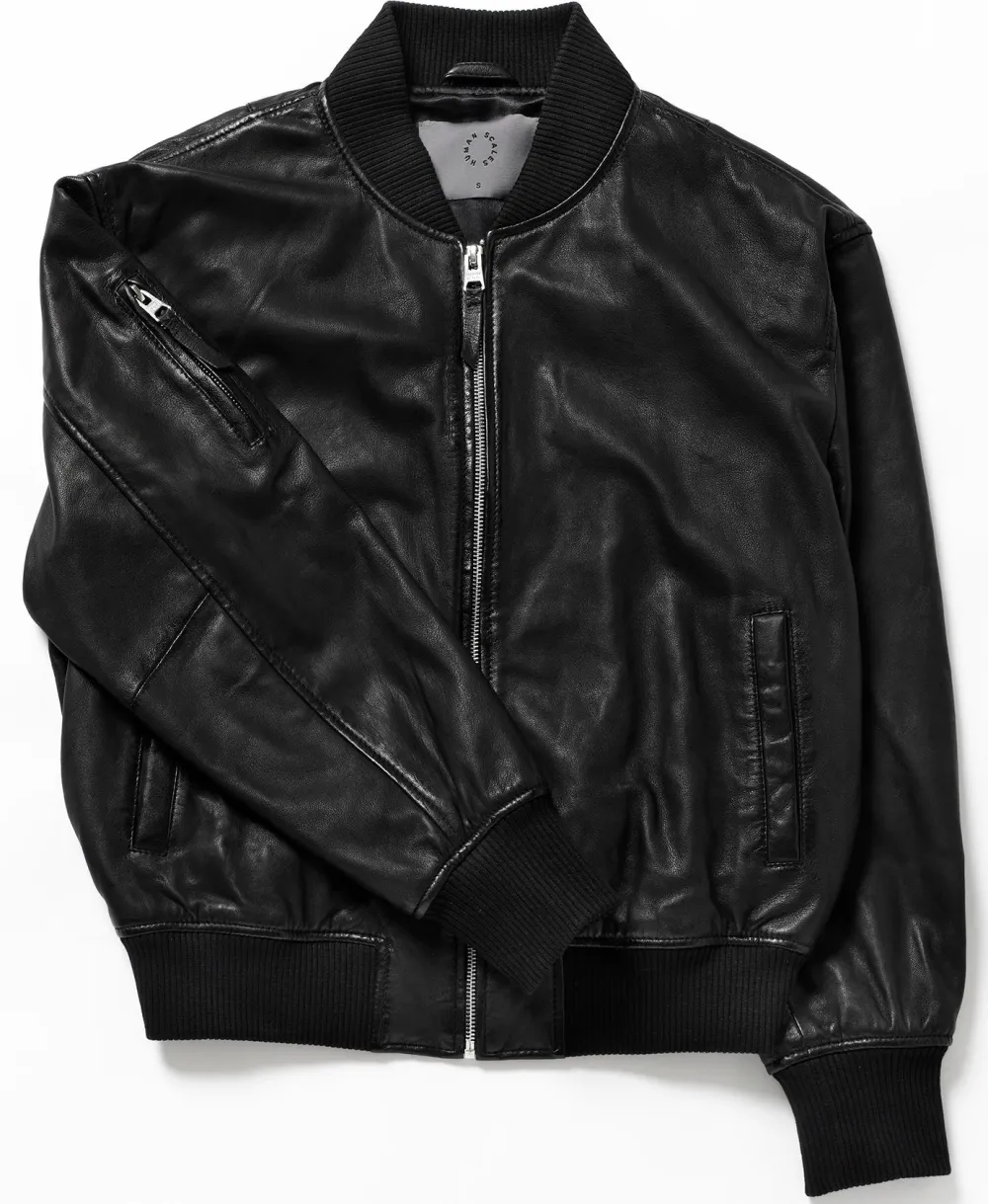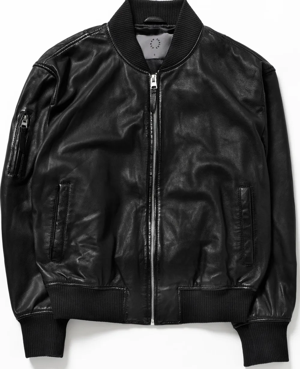 Pehmeä lampaannahkainen takki ylisuurella istuvuudella. Bomber malli. Musta satiinivuori, YKK-vetoketjut nahkaisilla remmeillä.