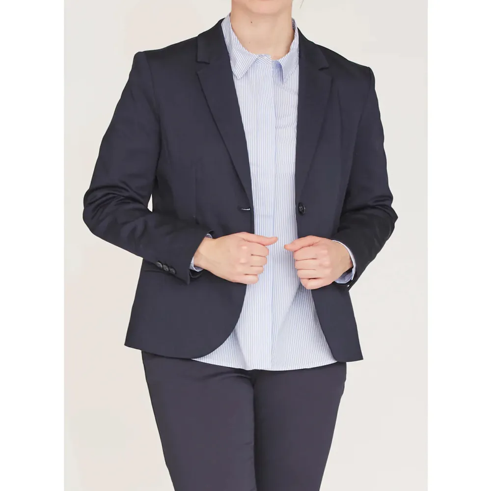 Naisten bleiseri. Edessä kaksi nappia kiinnitykseen sekä hihansuissa napitukset. Edessä molemmin puolin läppätaskut.