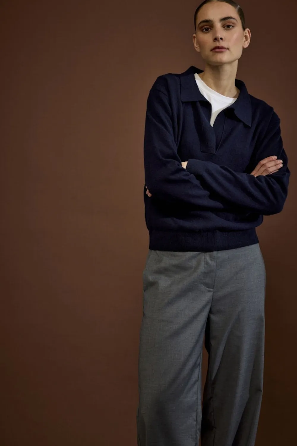Tämä tummansininen kauluksellinen neulepusero JC Sophielta yhdistää klassisen tyylin ja mukavan mukavuuden. Hieno neulos ja kaulus antavat neuleelle tyylikkään silauksen – täydellinen valinta tyylikkääseen arkityyliin.