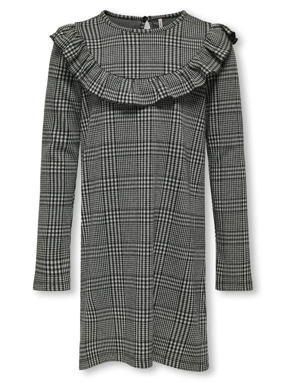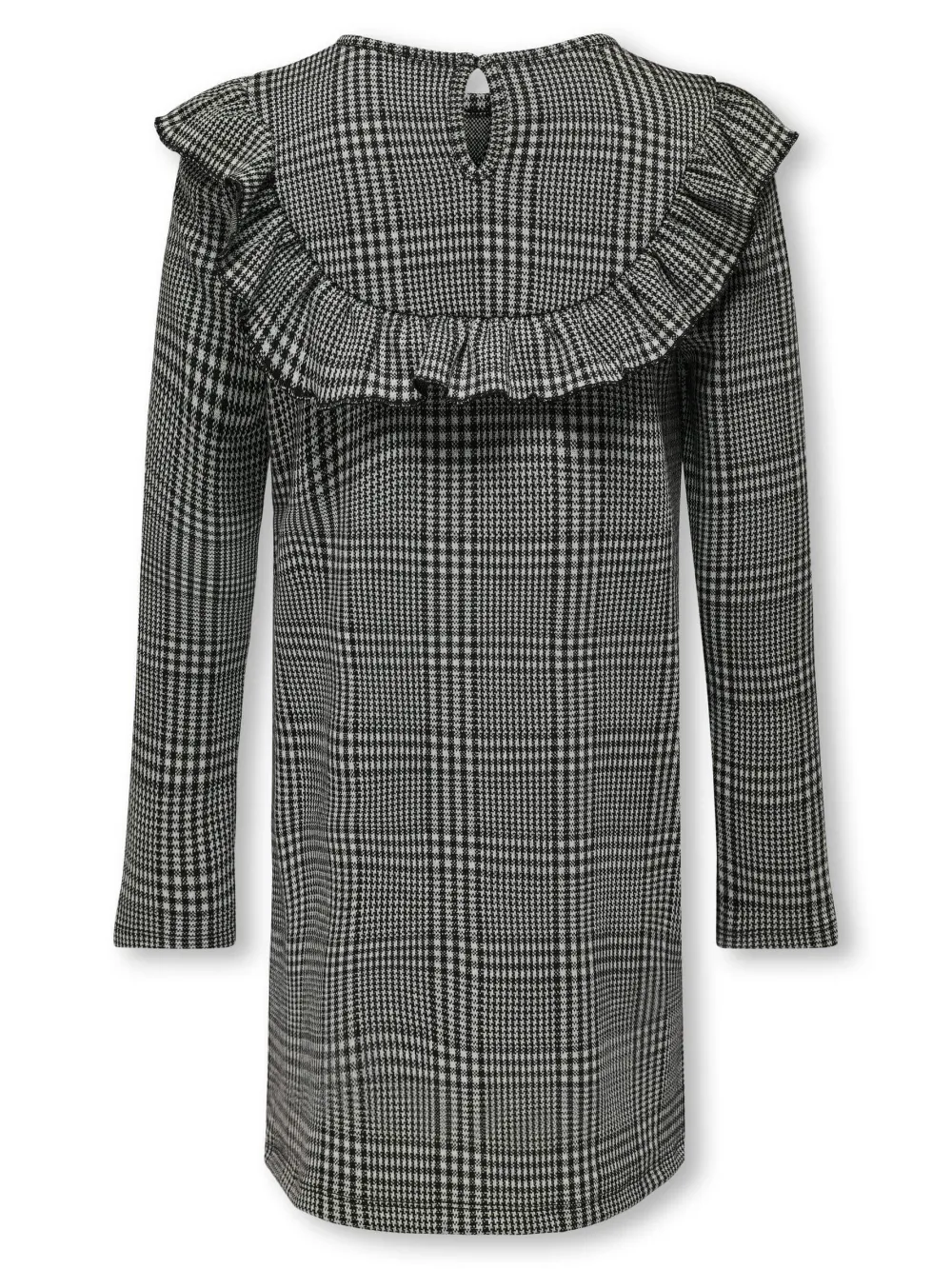 Mukavan tyylikäs ruutumekko röyhelöyksityiskohdilla.
